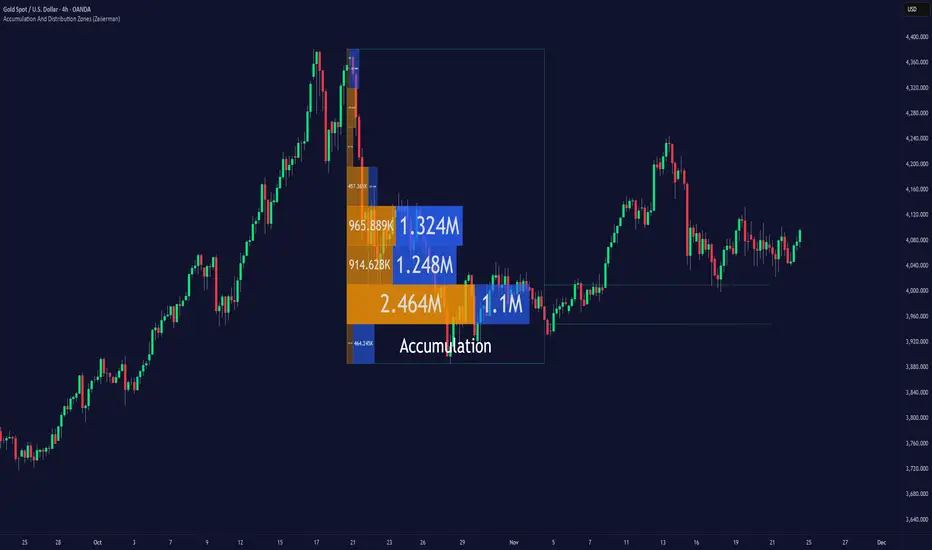 Accumulation And Distribution Zones (Zeiierman) is a structural zone indicator that highlights where the market has recently been absorbing sell pressure (Accumulation) or releasing buy pressure (Distribution).