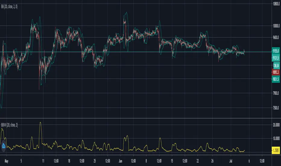 Changed the way the data is presented by indexing the spread of the Bollinger Bands relative to the price of the asset. Basically just used the Bollinger Bands Width function that already exists and multiplied by 100 to get more precision. My eventual goal is to figure out a threshold that when reached, creates a general signal of upcoming high volatility. That signal can then be used in conjunction with other indicators (to detect the direction of a trend) to create a buy or sell signal.