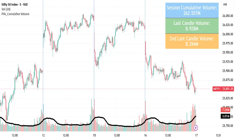The PFA_Cumulative Volume indicator implements a session-normalized volume aggregation framework that conditionally resets at each daily time boundary, thereby isolating intraday participation dynamics from multi-day carryover noise. By cumulatively summing raw traded volume from the session open, the script constructs a real-time proxy for directional conviction and liquidity absorption across the trading day.