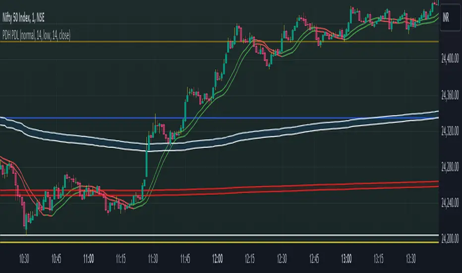 Have plotted Previous day High, previous day low, previous day close and previous day open. Moreover Previous month High and low are plotted. Background changes are made as per this concept: when the current day's price is above PDL and below PDH, a green background when the current price is above both PDL and PDH, and a red background when the current day's price is below both PDL and PDH.