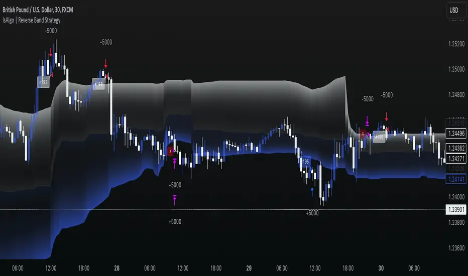 The entry candle closes above the upper band, signaling a potential downward reversal. The strategy enters a short position anticipating the price to revert towards the lower band.► Features and Settings:⚙︎ Band Customization: Adjust band length, smoothness, and minimum distance to fit different market conditions and trading styles.