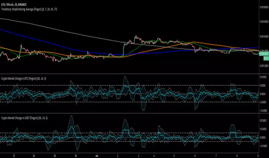 Crypto Market Change provides an indication of whether the value of a basket of 19 coins traded in BTC on Binance (as of July 12, 2018) are headed up or down. A simple moving average of the percentage change in BTC price for each coin is calculated. The moving averages are then summed and displayed. A measure of price volatility is indicated by standard deviation bands. Period, moving average length, and number of standard deviations are adjustable.