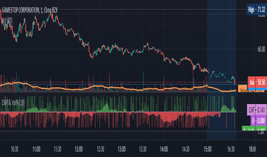 Showing the CMF, with green / red fill for positive / negative values, overlaid with Volume Percentage, displaying buying as green and positive, selling as red and negative.