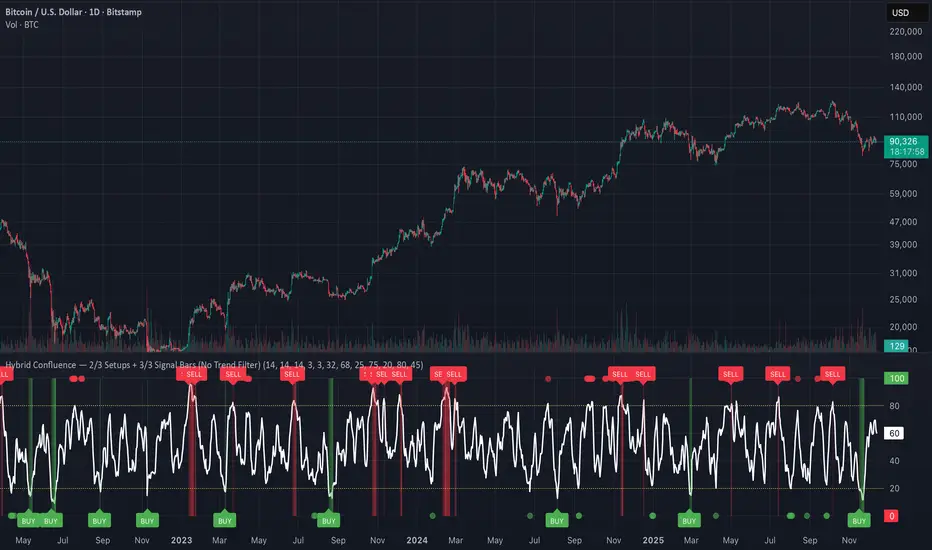 Many traders explore multi-oscillator hybrid confluence approaches that combine momentum and volume signals—most commonly RSI, Money Flow Index (MFI), and Stochastic RSI—to study stretched market conditions. These hybrid concepts are widely used to analyze potential exhaustion zones, cycle extremes, and periods of sustained buying or selling pressure across different timeframes.