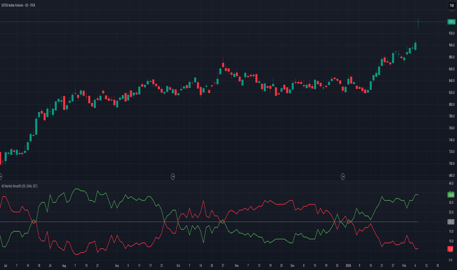 40 Market BreadthThis is a Market Breadth Indicator designed to track how many stocks within a specific group (in this case, 40 Thai stocks from the SET index) are trading above or below a chosen Moving Average.
