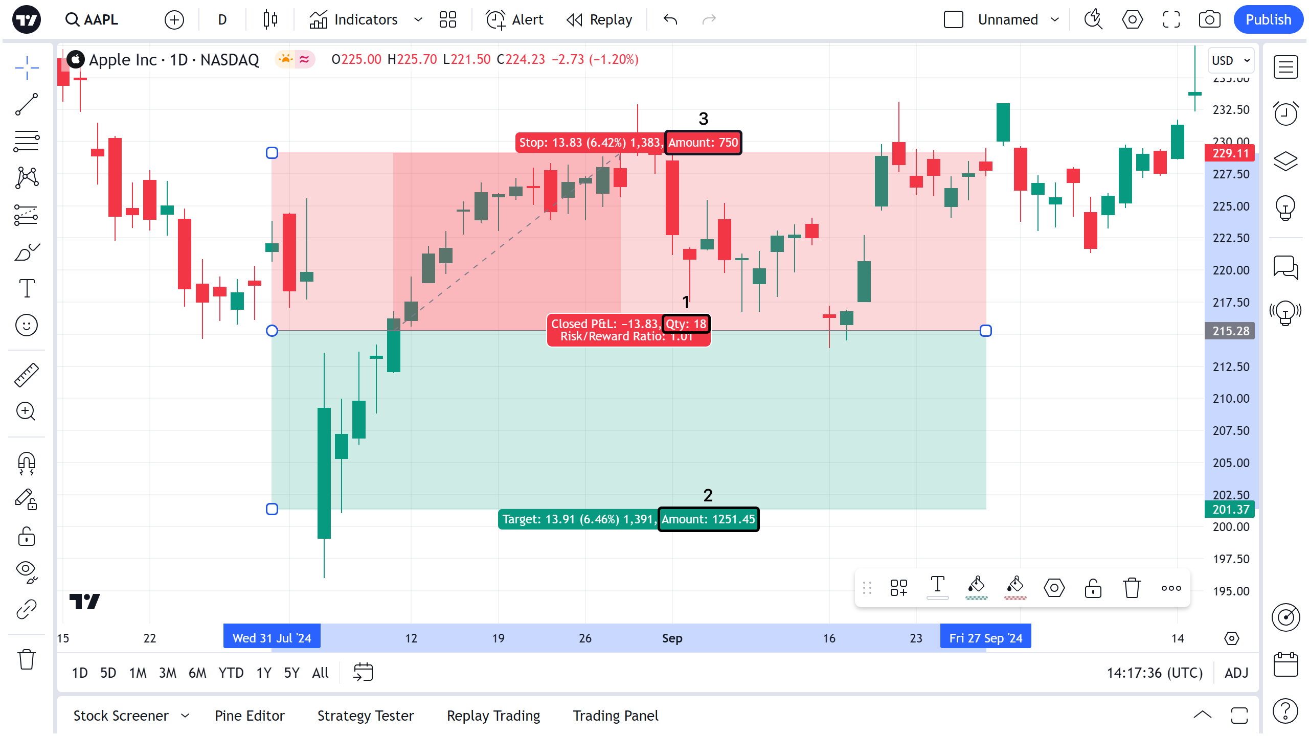 3. ستظهر لك علامات أداة الرسم حجم الصفقة (1) ورصيد الحساب عند إغلاق المراكز بعد الوصول إلى مستوى جني الأرباح (2) أو مستوى إيقاف الخسارة (3).