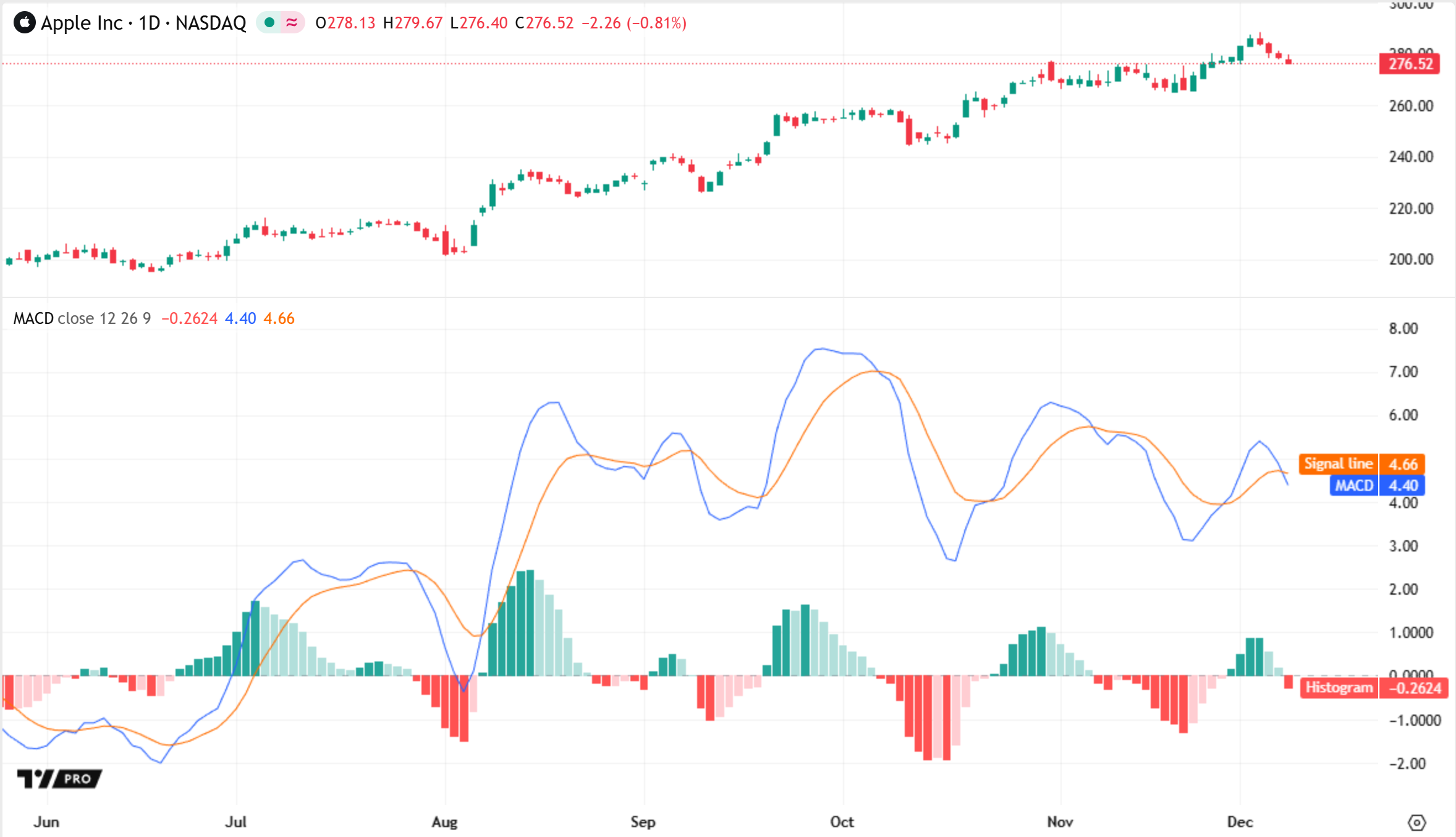 يرسم المؤشر قيم MACD والإشارة كخطوط وقيم الرسم البياني كأعمدة رقمية بالألوان. كما يعرض أيضًا خط صفر أفقي للتمييز بين القيم الإيجابية والسلبية.
