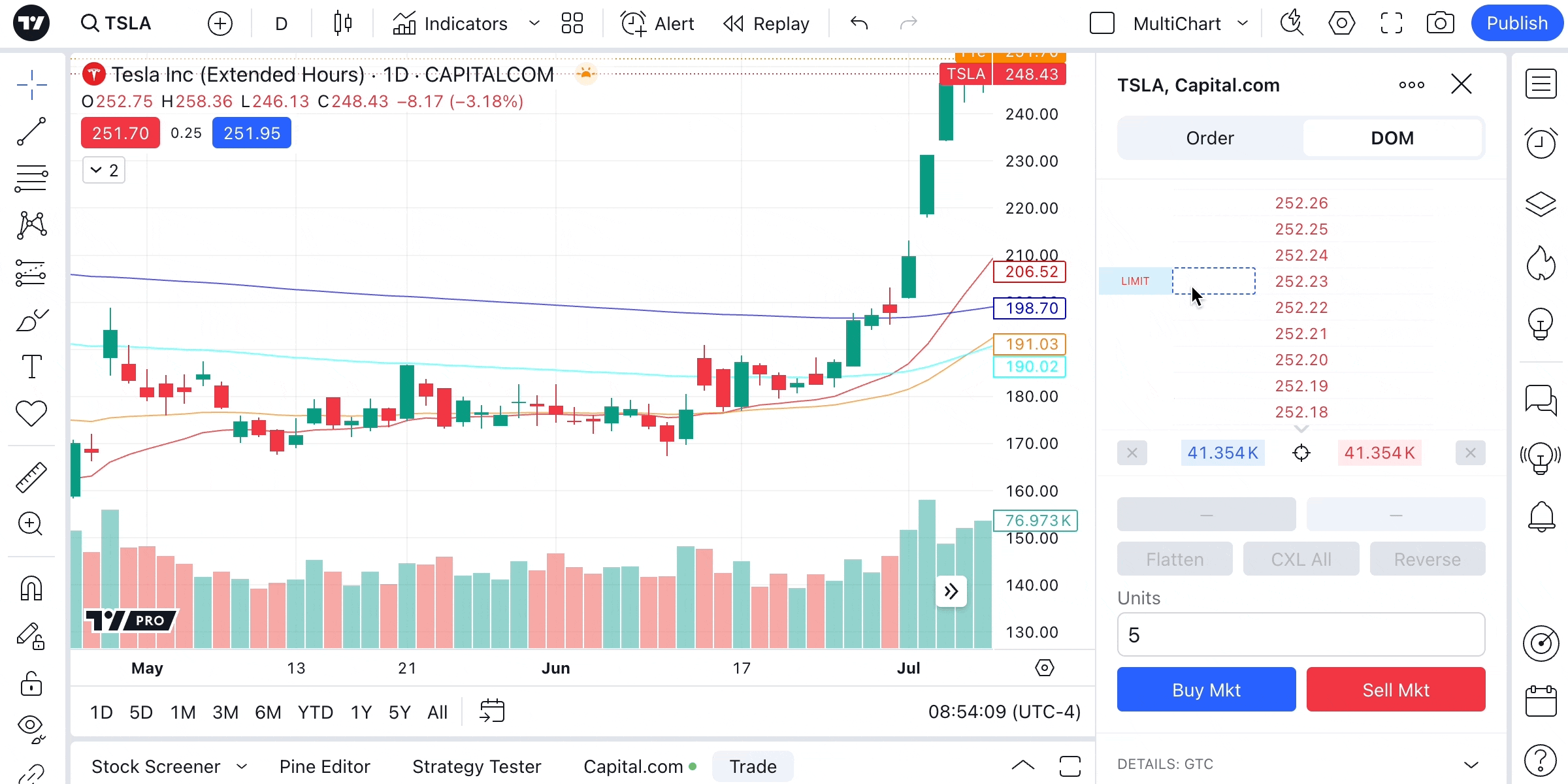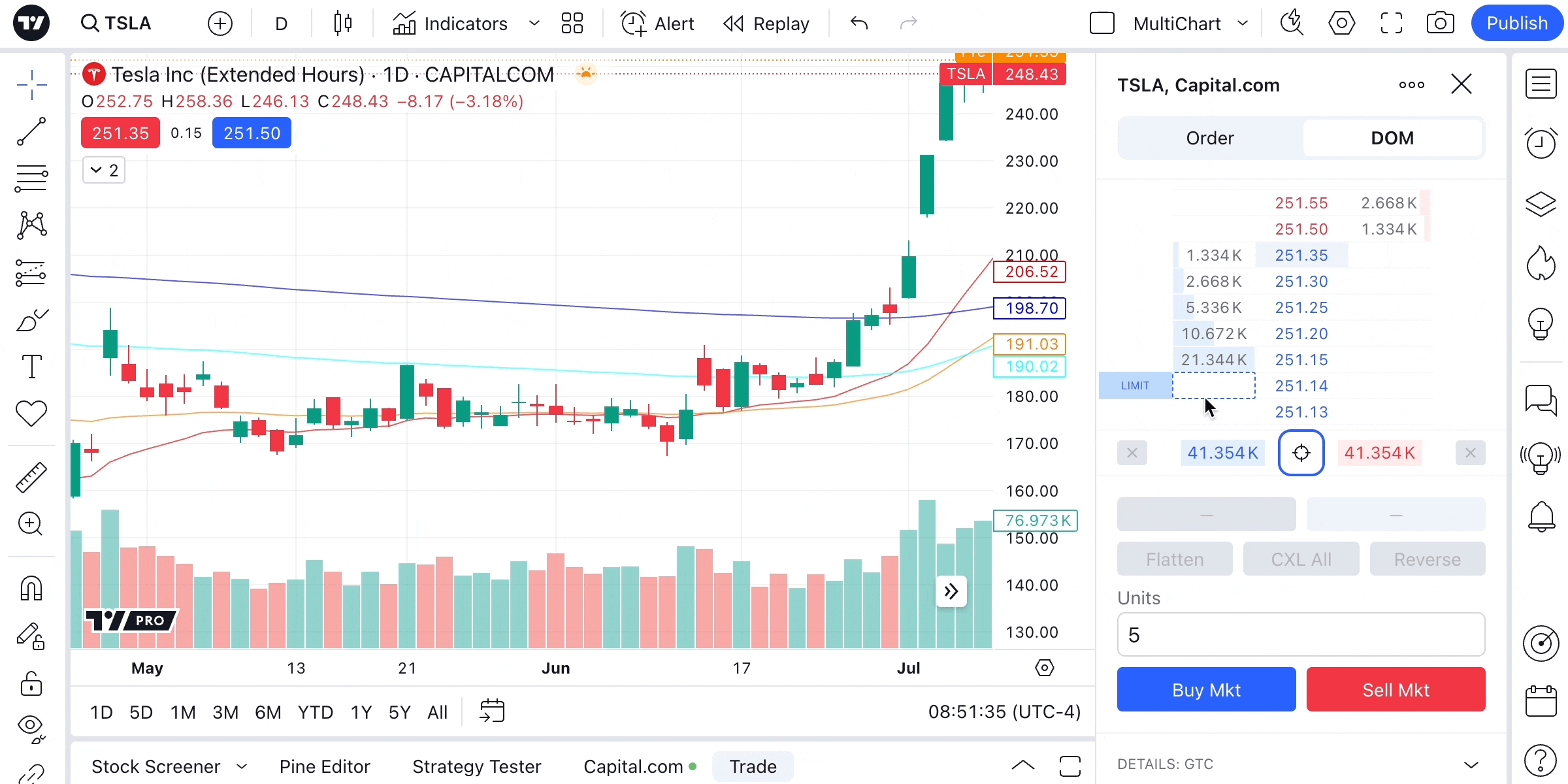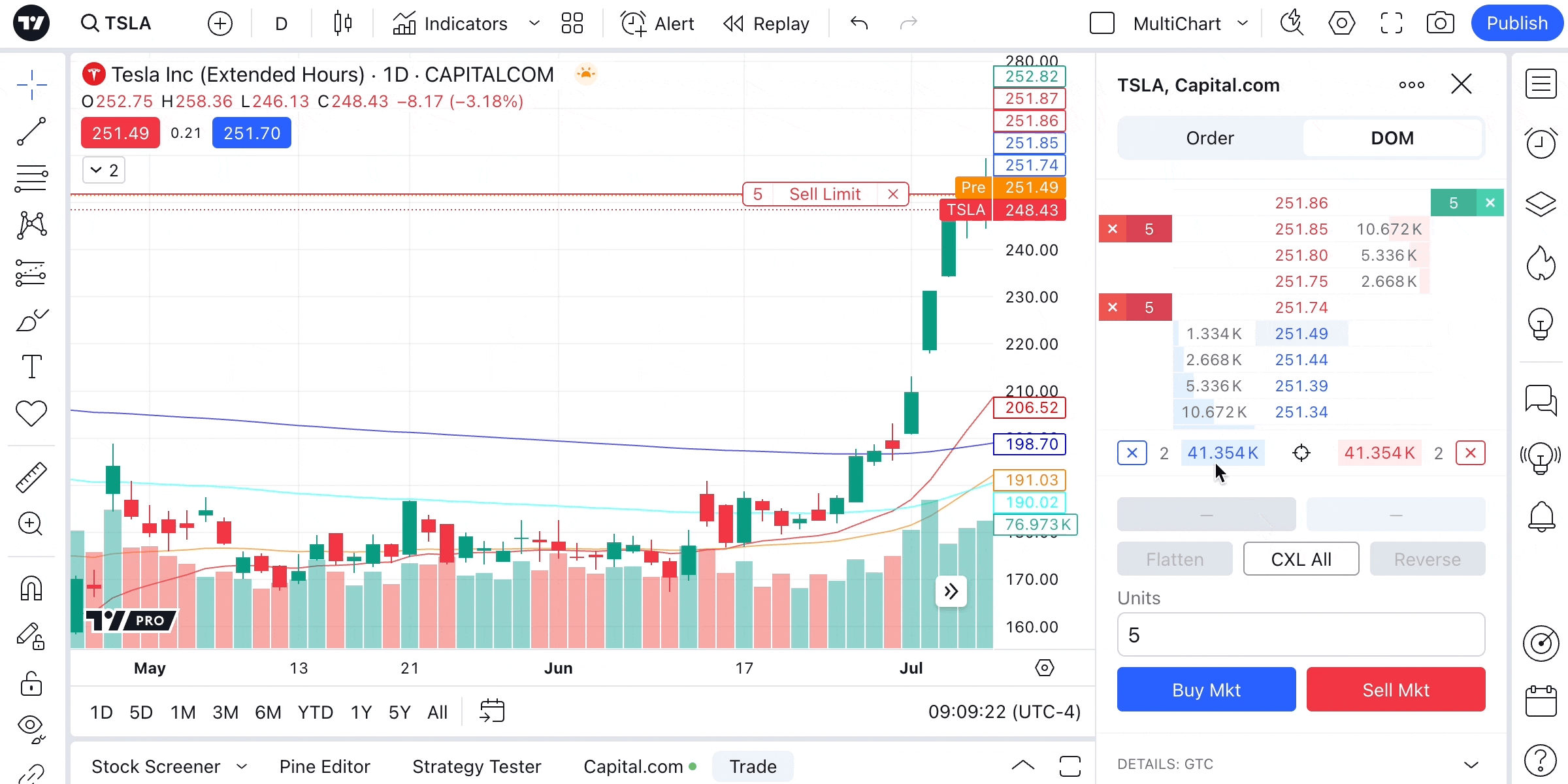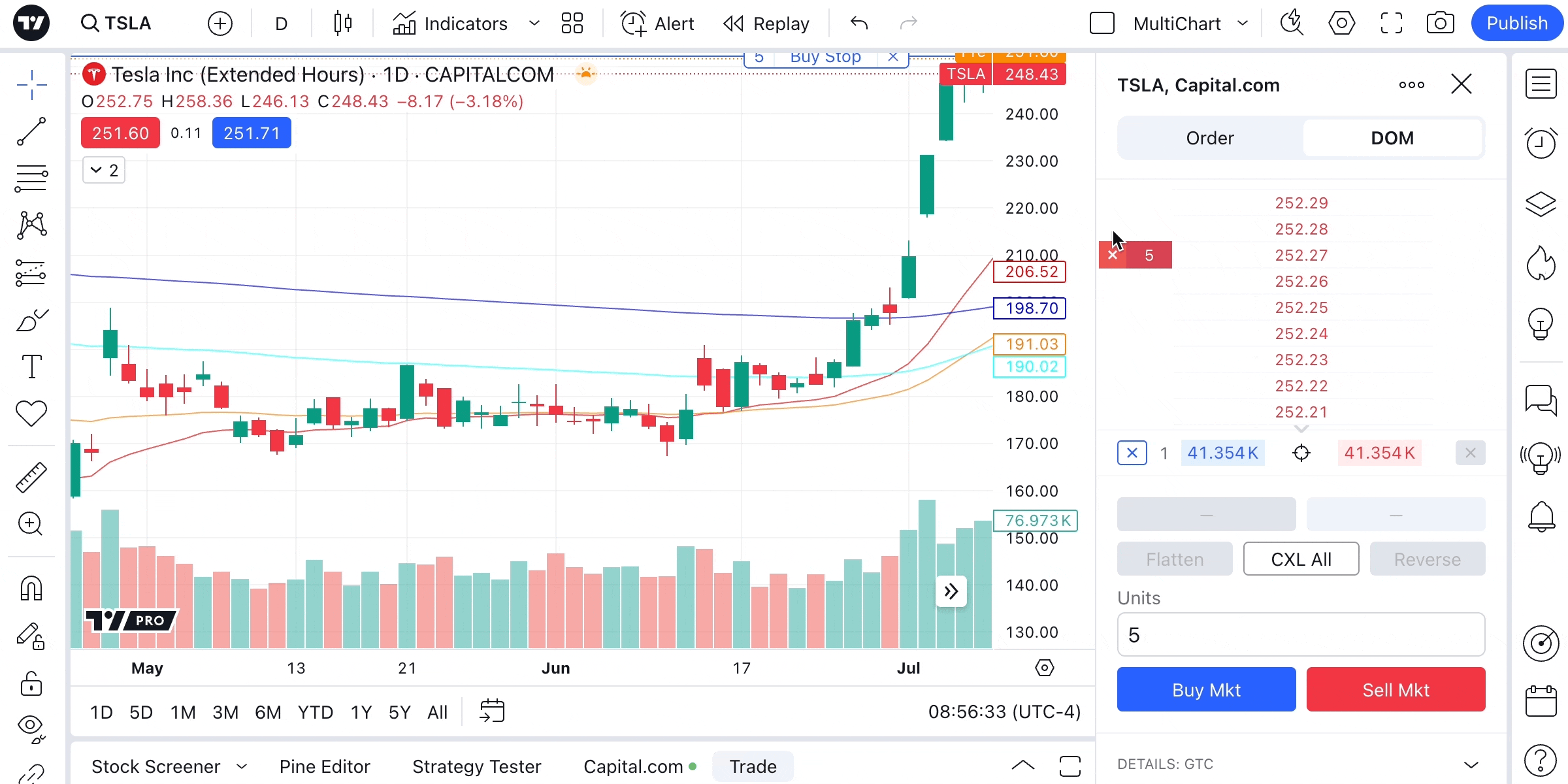 - إذا قمت بالنقر فوق علامة تبويب DOM، فسترى عمق السوق للأصل المحدد على الرسم البياني