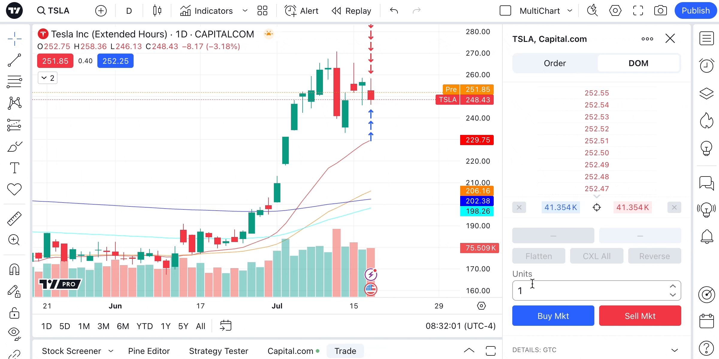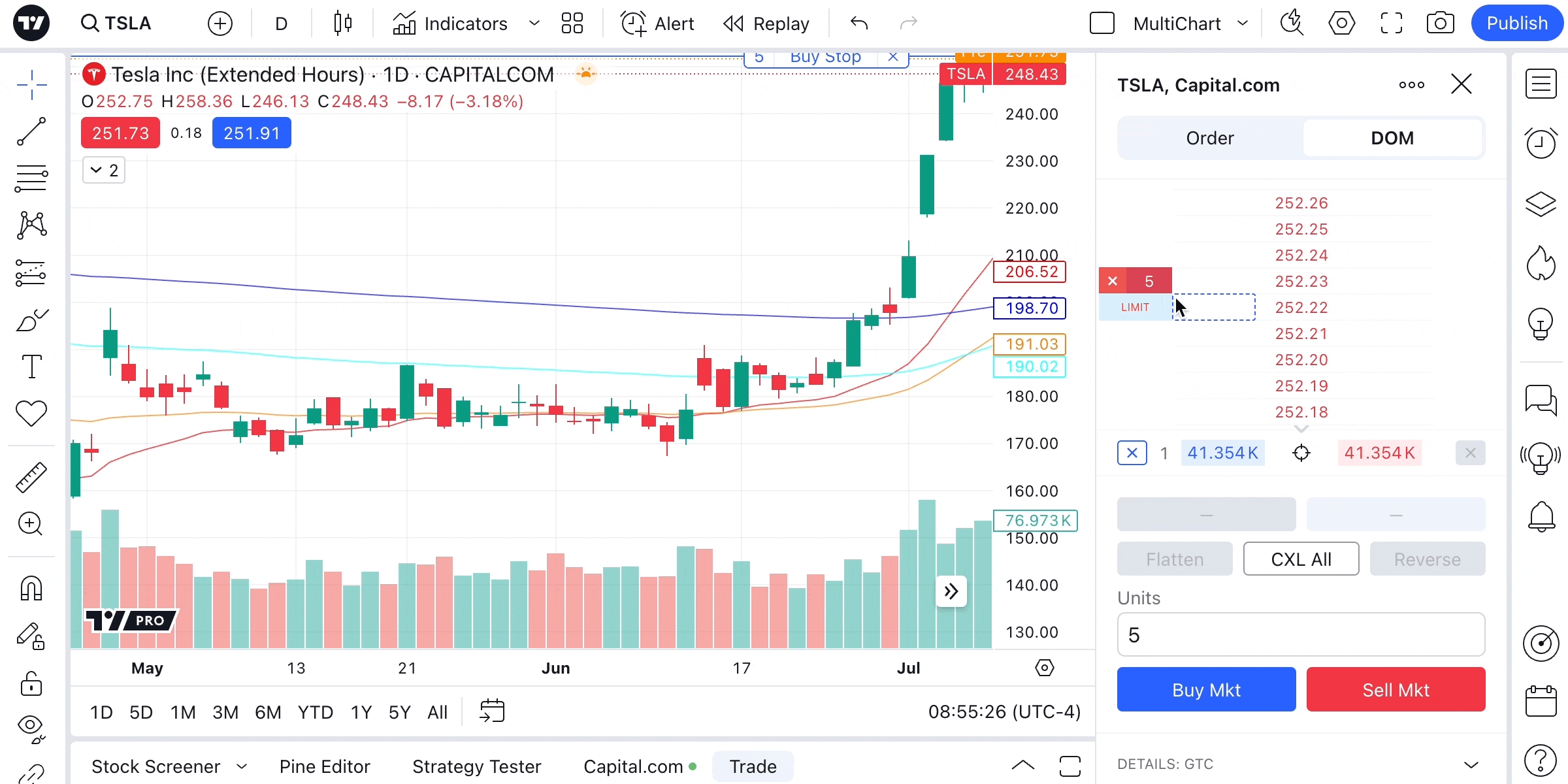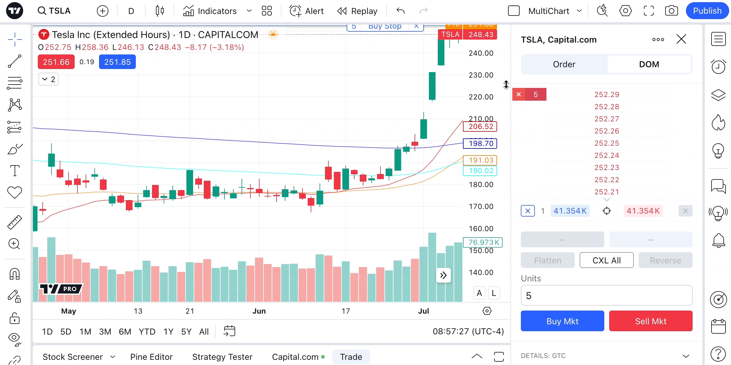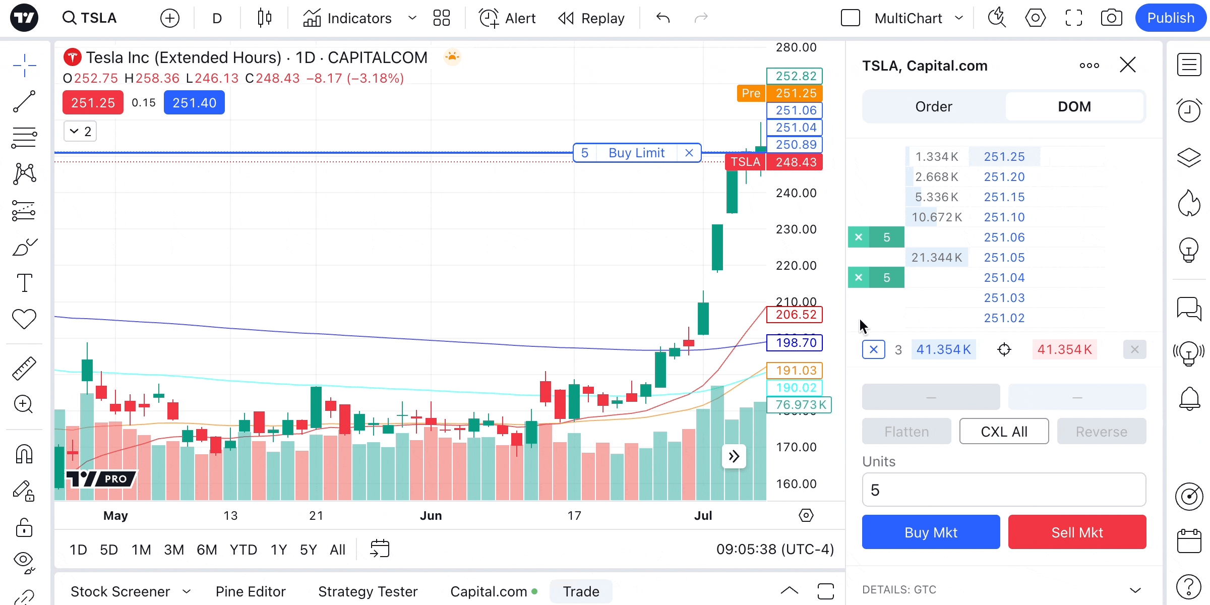 - إذا قمت بالنقر فوق علامة تبويب DOM، فسترى عمق السوق للأصل المحدد على الرسم البياني