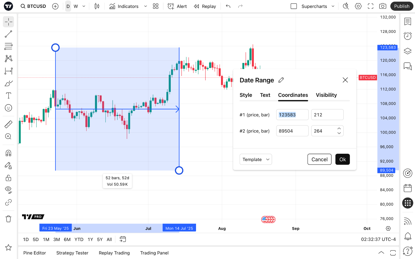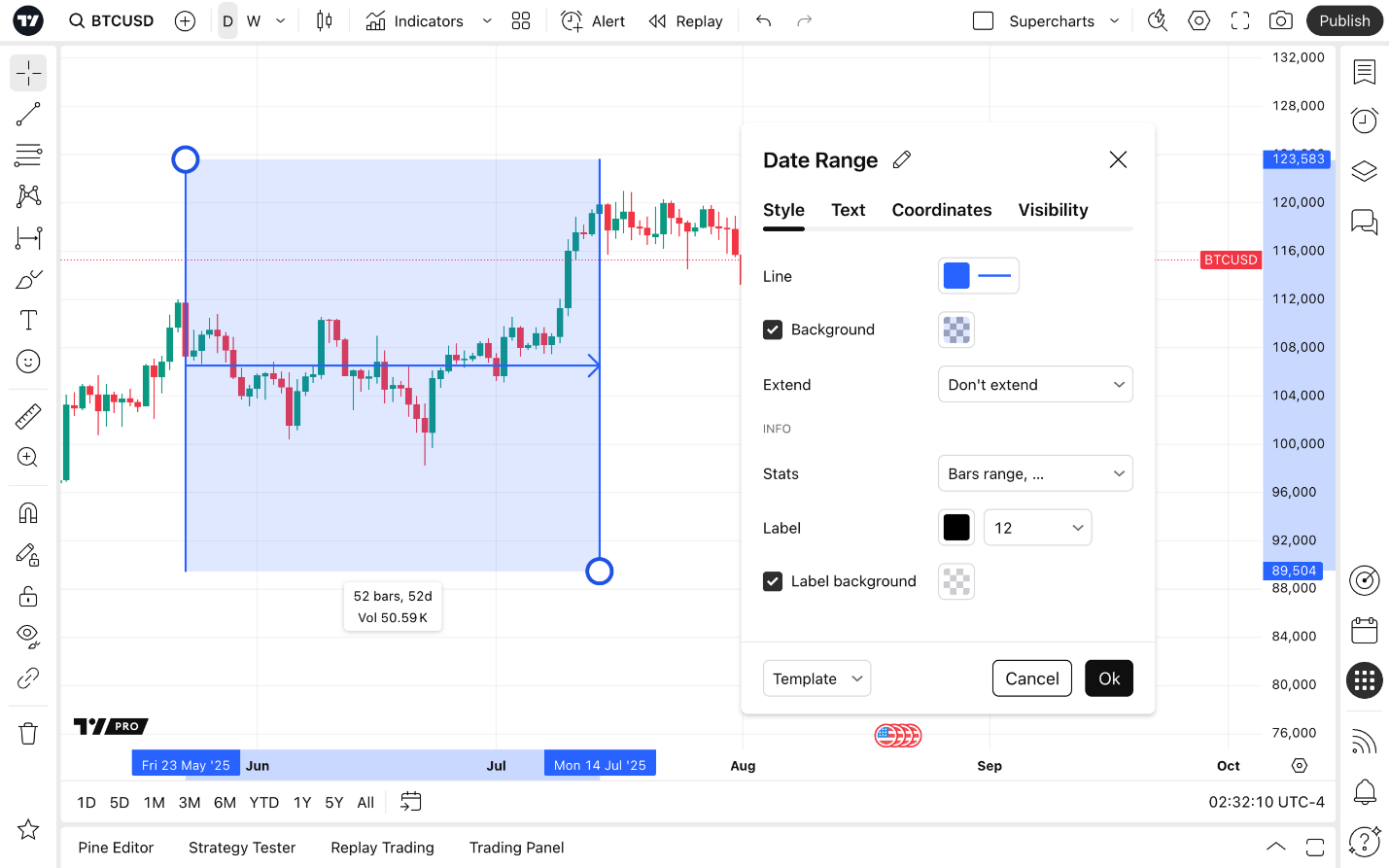 تتيح هذه الأداة للمستخدم وضع النقاط أفقيًا على نقطتين زمنيتين مختلفتين. سيظهر بعد ذلك مربع مظلل بين النقاط المختارة يعرض النطاق التاريخي (أو النطاق الزمني على فترات خلال اليوم). سيظهر النص أيضًا على طول المربع، وسيعرض عدد الأعمدة بالإضافة إلى الوقت الذي مر خلال النطاق التاريخي/ الزمني.