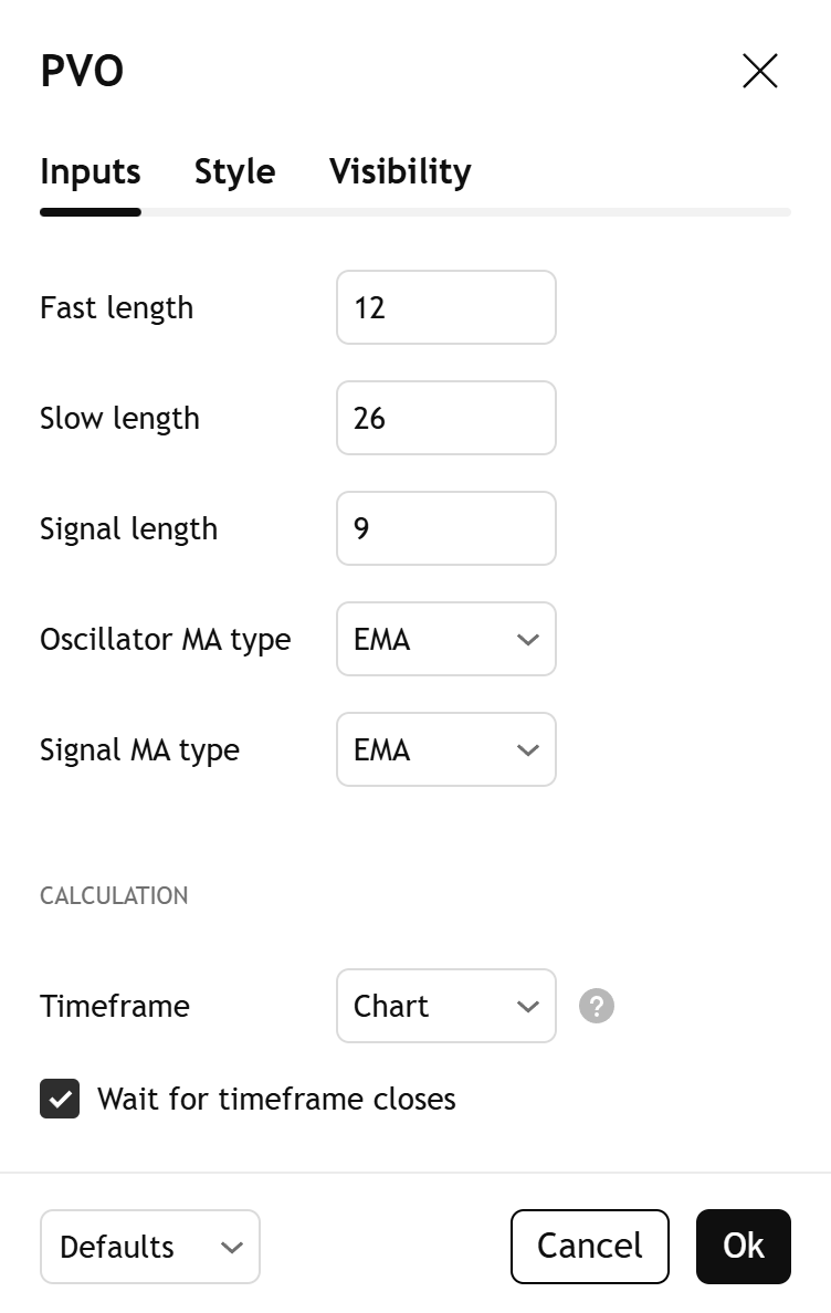 مذبذب النسبة المئوية للحجم (PVO) هو مؤشر الزخم للحجم. وهو يقيس الفرق النسبي بين متوسطين متحركين قائمين على الحجم. على غرار مؤشرات MACD و PPO، يتكون PVO من ثلاثة مكونات: المذبذب الرئيسي وخط الإشارة السلس وخط الرسم البياني الذي يمثل الفرق بين هذه القيم.