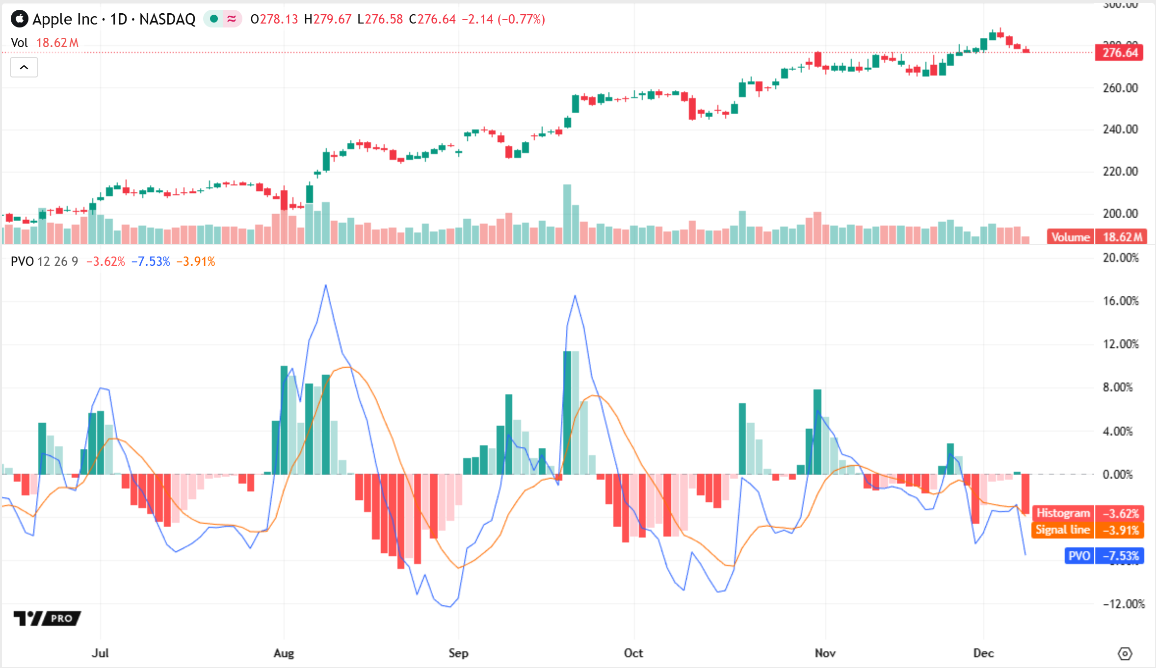 يرسم المؤشر قيم PVO والإشارة كخطوط وقيم الرسم البياني كأعمدة مرمزة بالألوان. كما يعرض أيضًا خط صفر أفقي للتمييز بين القيم الإيجابية والسلبية.