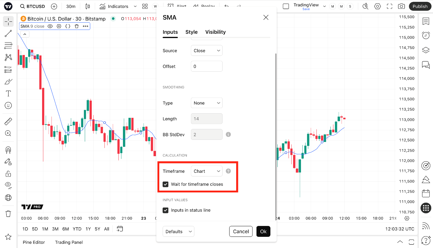 تأتي العديد من المؤشرات المضمنة لدينا مزودة بدالة MTF. عند القيام بذلك، ستحتوي علامة تبويب «الإعدادات/المدخلات» في النص البرمجي على قسم «الحساب» مع قائمة منسدلة «الإطار الزمني»، حيث يمكنك تحديد الإطار الزمني الذي تريد حساب هذا المؤشر المحدد عليه. يتيح لك ذلك إلقاء نظرة، على سبيل المثال، على مخطط مدته ساعة واحدة ومشاهدة المتوسط المتحرك اليومي في نفس الوقت.