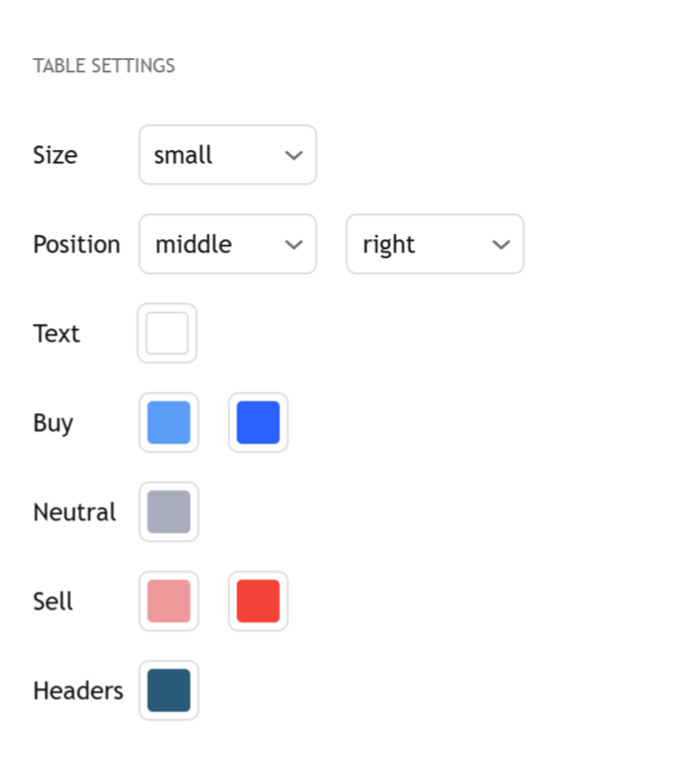 - مدخلات الألوان: عيّن نص الجدول وألوان الرأس وألوان الخلفية لكل فئة تصنيف. تقوم مدخلات ألوان الشراء والمحايدة والبيع أيضًا بتعيين ألوان الأعمدة المرسومة.