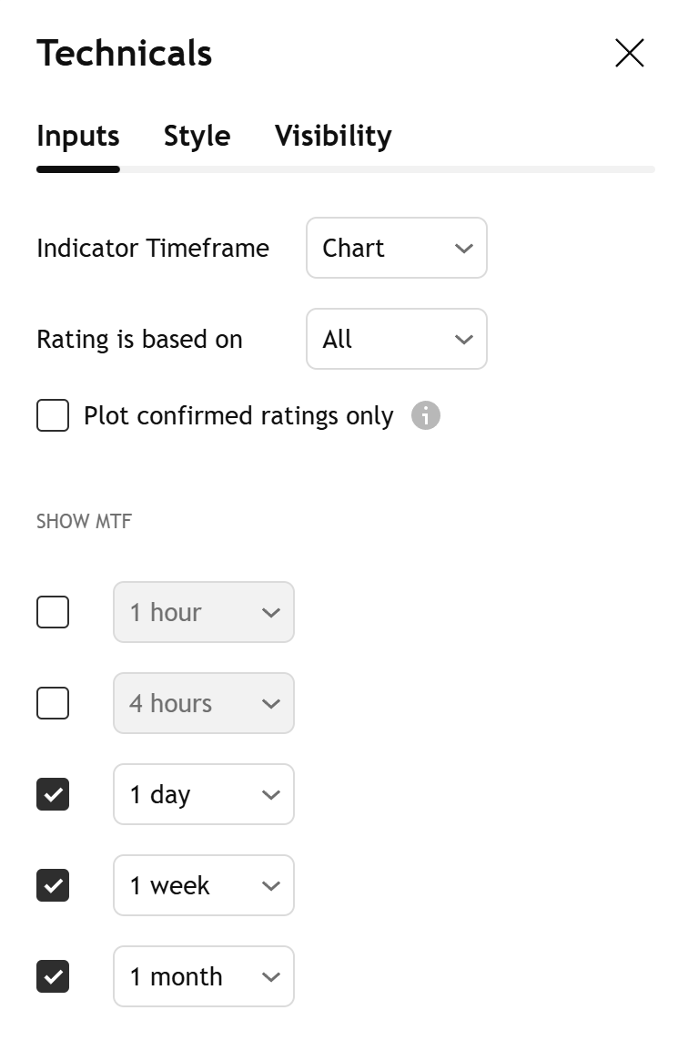 يقوم هذا المؤشر بتقييم التصنيفات بناءً على مجموعة من الشروط من 26 مؤشرًا أساسيًا، بما في ذلك المتوسطات المتحركة ومؤشرات التذبذب. بالإضافة إلى ذلك، تقوم بتقييم هذه التقييمات عبر أطر زمنية متعددة وتعرض فئاتها في جدول. يمكن أن يعرض المؤشر معلومات التصنيف للمتوسطات المتحركة أو مؤشرات التذبذب أو مزيج من الاثنين معًا.