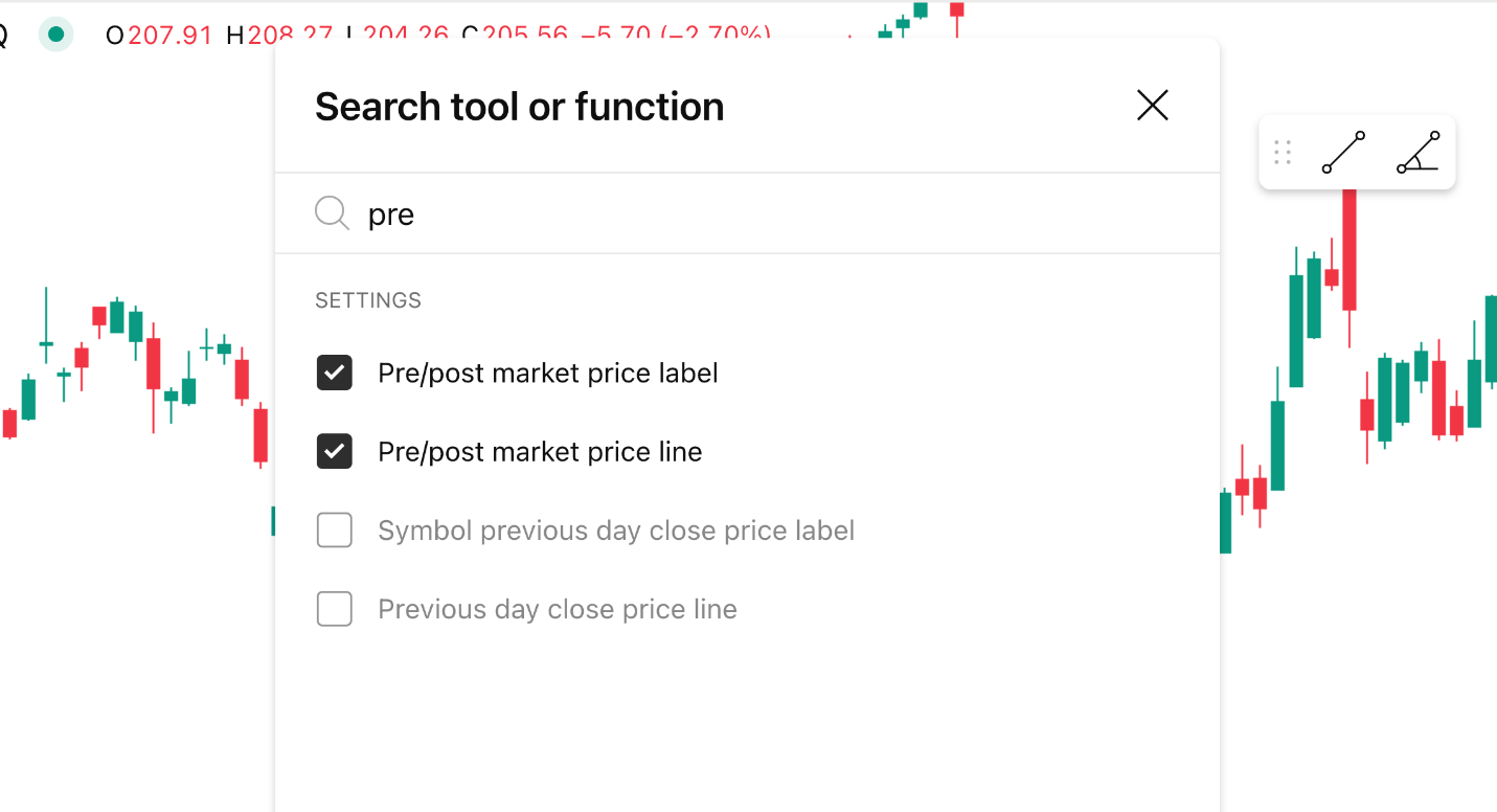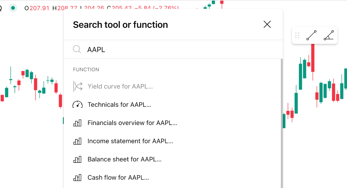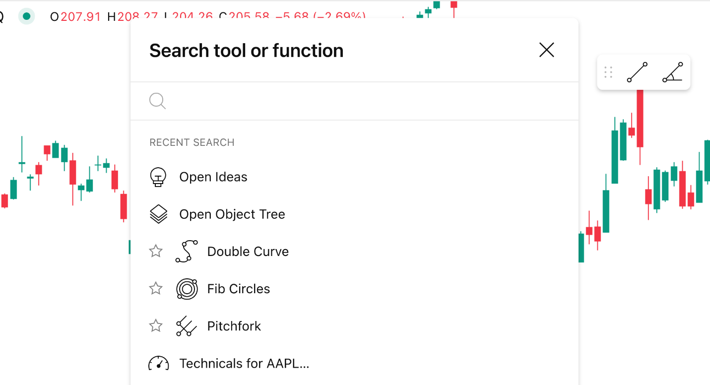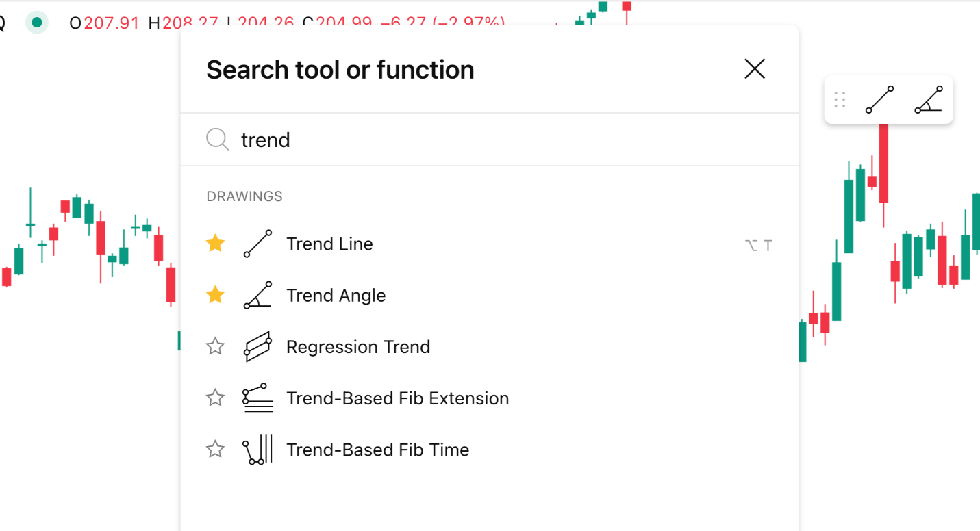 - الرسومات: هل تريد إضافة خط اتجاه أو تصحيح فيبوناتشي أو مستطيل؟ ما عليك سوى البدء في كتابة اسم الأداة. بمجرد ظهوره، يمكنك تحديده على الفور، أو حتى إضافته إلى مفضلاتك للوصول بشكل أسرع في المرة القادمة.