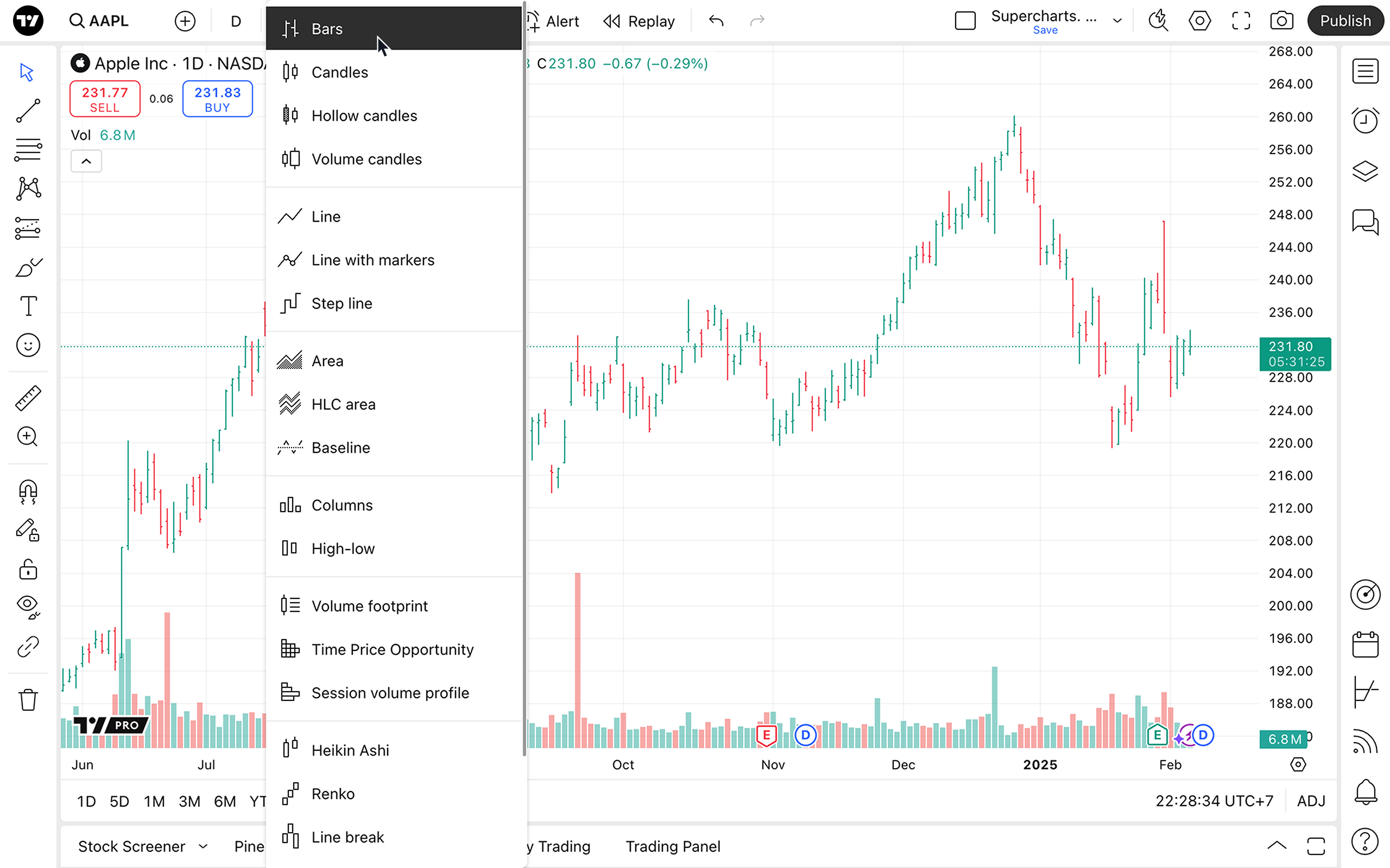 بمجرد دخولك إلى Supercharts، افتح قائمة أنواع الرسوم البيانية من شريط الأدوات العلوي، ثم اختر أعمدة/ Bars.
