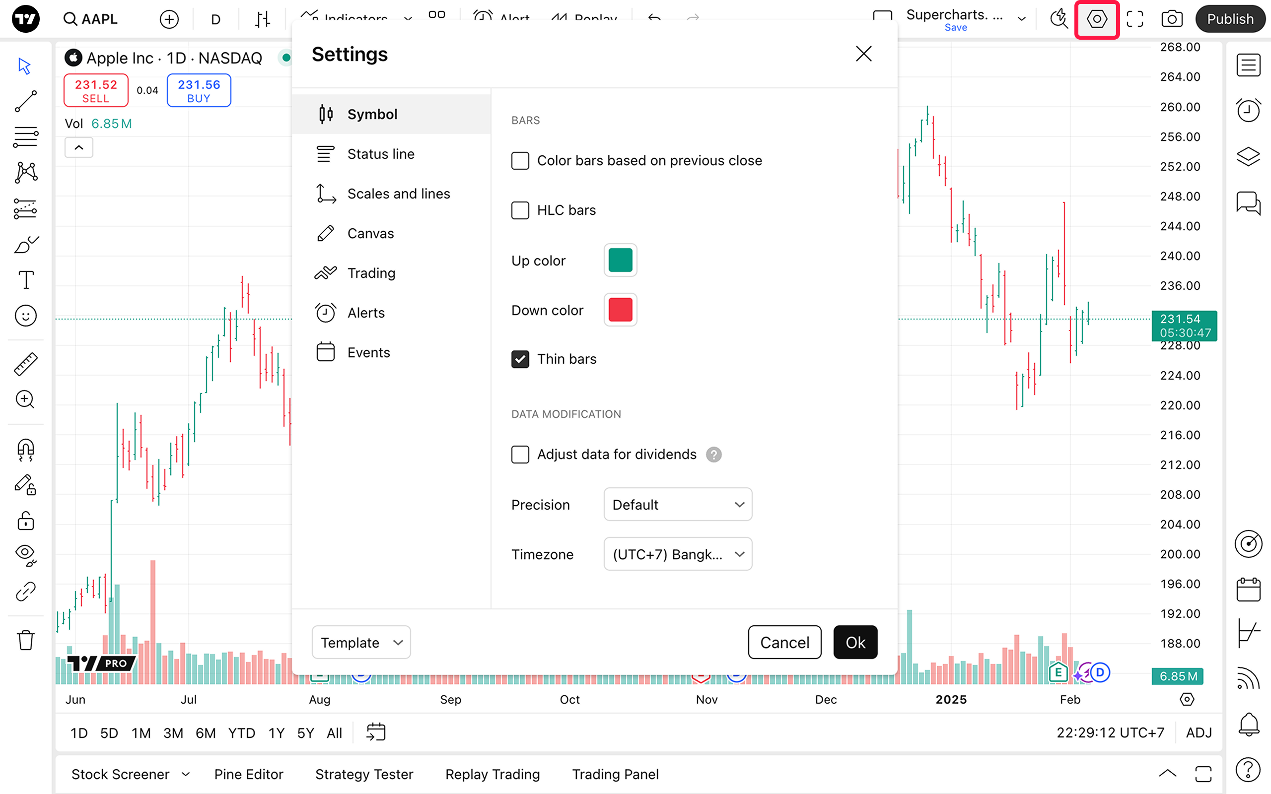 3 -لون الصعود / لون الهبوط. يمكن تخصيص ألوان الأعمدة الصاعدة والهابطة وفقًا لتفضيلاتك. اللون الافتراضي هو الأخضر للحركة الصعودية (عندما يكون الإغلاق أعلى من الافتتاح) والأحمر للحركة الهبوطية (عندما يكون الإغلاق أقل من الافتتاح).