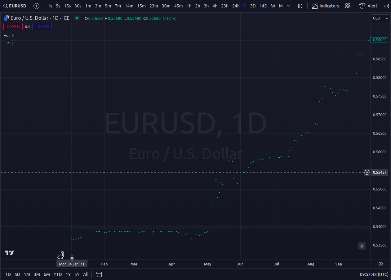 لماذا تعود البيانات التاريخية على رسم FX_IDC:EURUSD إلى عام 1971؟