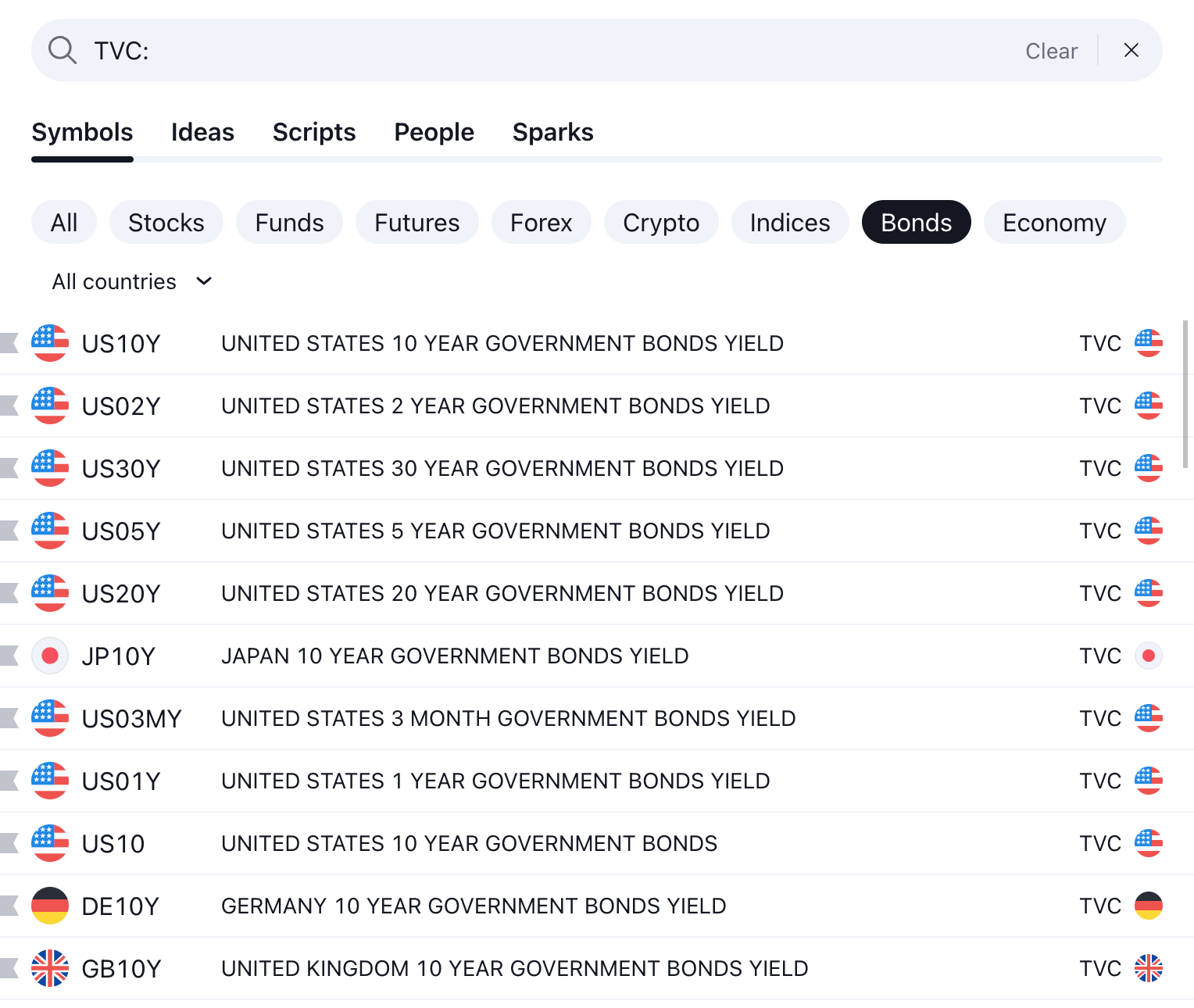 بالإضافة إلى ذلك، توفر TradingView سندات TVC الحكومية من Refinitiv. يمكن العثور عليها في تبويبة السندات: