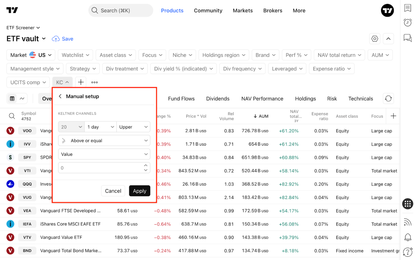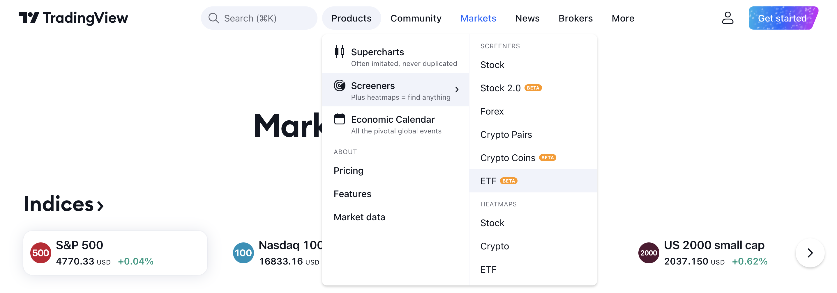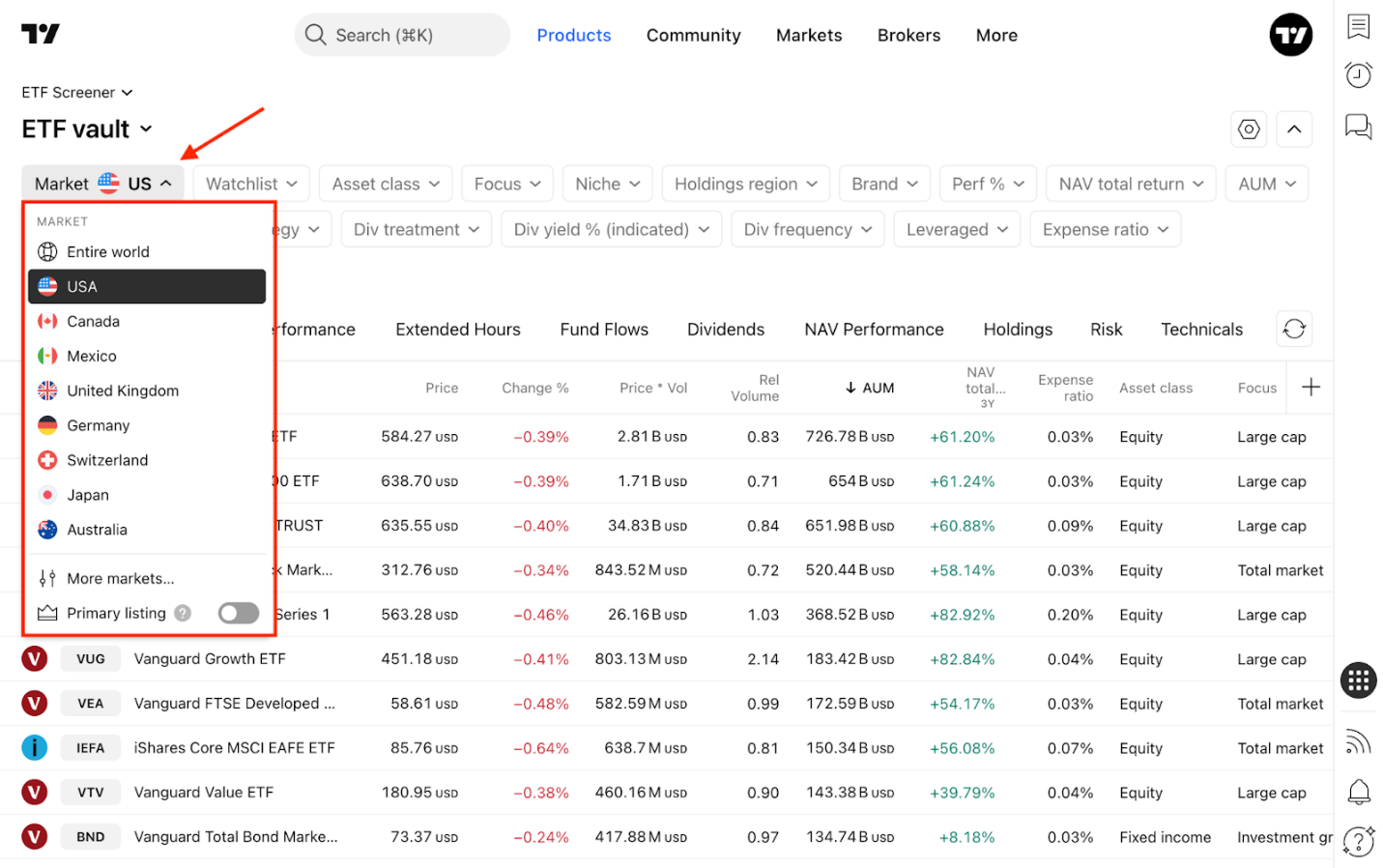 طريقة أخرى هي من Supercharts. على شريط الأدوات الأيمن، انقر فوق «المنتجات» → «منصات الفلترة». في الجزء العلوي، انقر فوق «منصة فلترة الأسهم» وانقر على «ETF Screener».