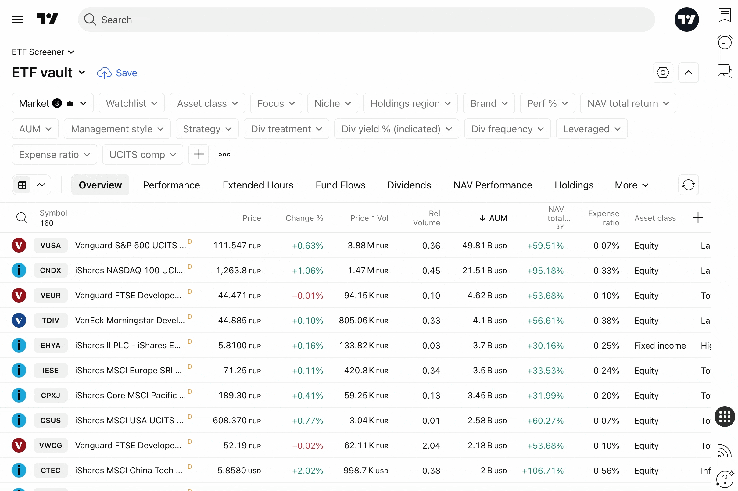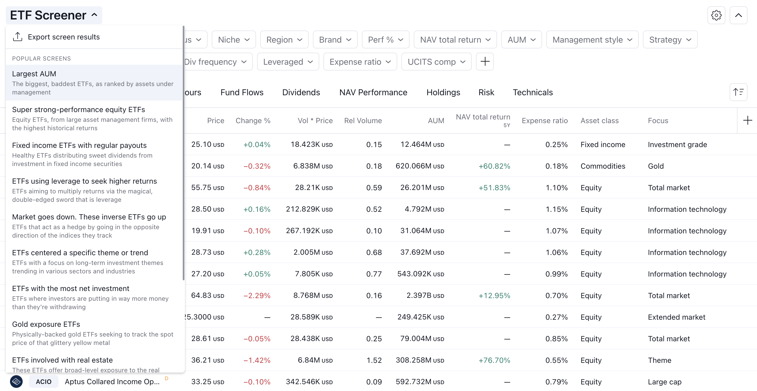 ETF Screener هي أداة تحليل مالي تسمح لك بتطبيق عوامل تصفية مختلفة على جوانب ETF المتعددة مثل صافي قيمة الأصول ومنطقة المقتنيات وأسلوب الإدارة والمزيد. يعرض كلاً من المعلومات الأساسية والتقنية، بالإضافة إلى مخططات ETF - كل ذلك في أداة واحدة لتحليلك.