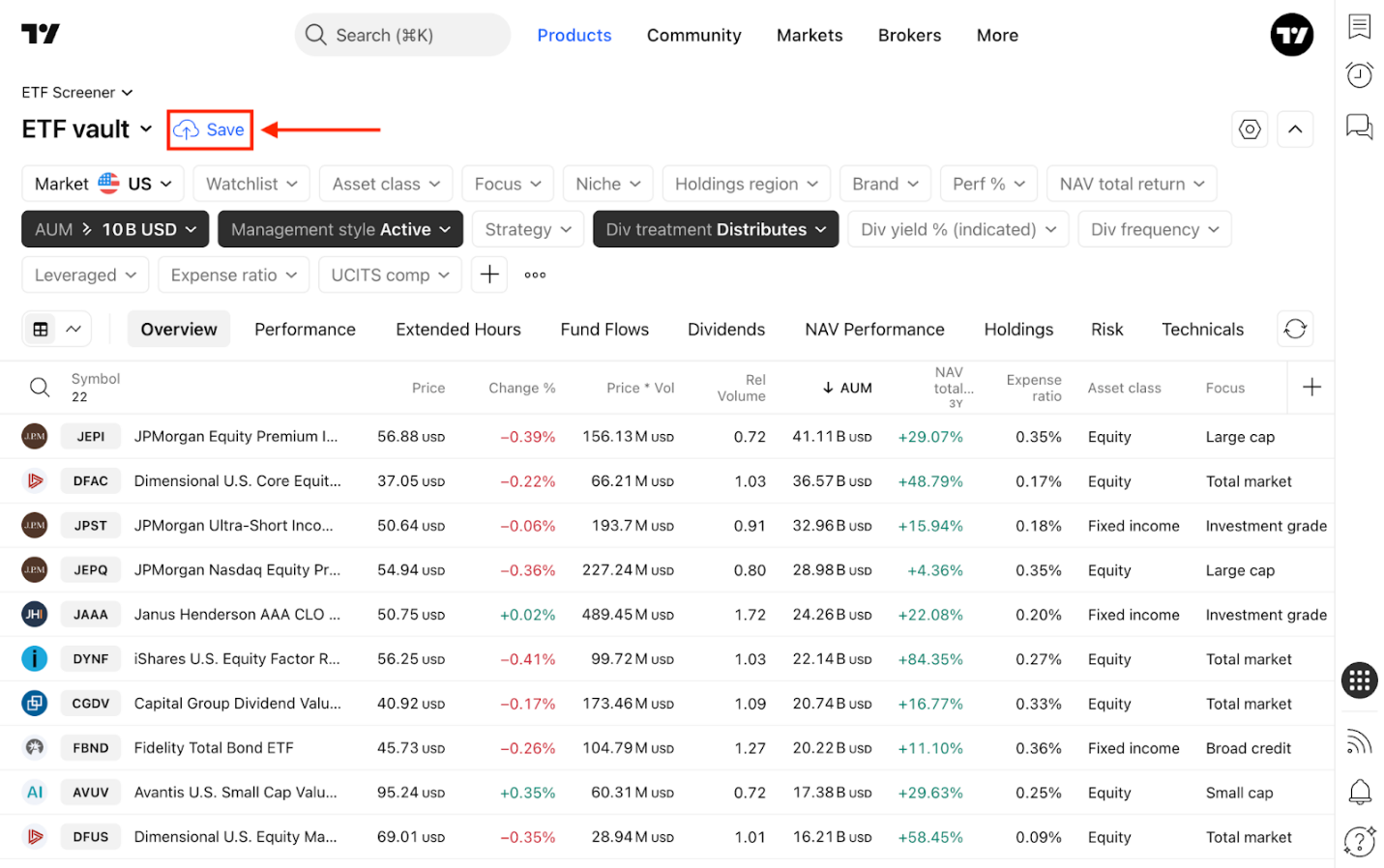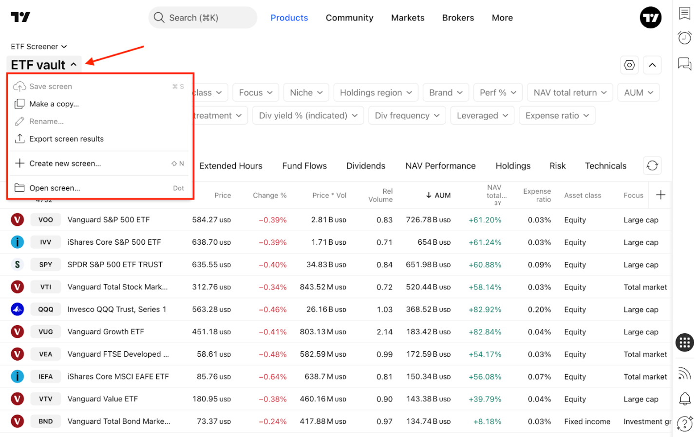 إحدى الميزات الرئيسية لـ ETF Screener هي القدرة على إنشاء منصات الفلترة متعددة وحفظها لمزيد من التحليل. يمكنك أيضًا استخدام مجموعات الفلاتر التي تم تكوينها مسبقًا والتي اخترناها لمساعدتك في اكتشاف الأموال التي قد تهمك. في الزاوية العلوية اليسرى، انقر على «ETF vault» → «فتح المنصة فلترة...».