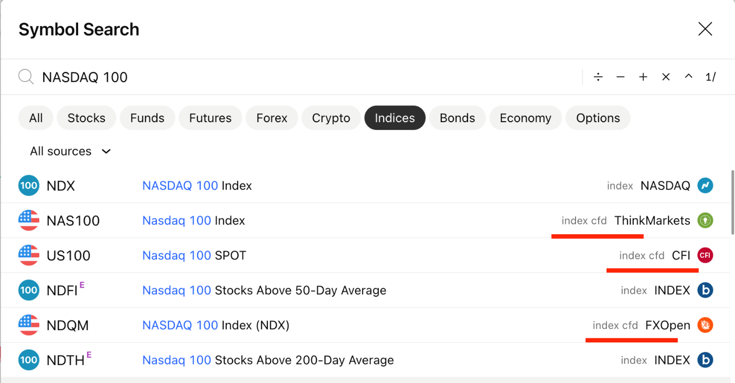 - المؤشرات، لأنها غير قابلة للتداول بشكل عام. على سبيل المثال NASDAQ: NDX
