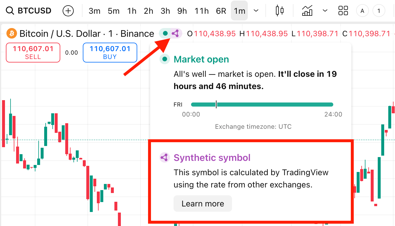 - الرموز الاصطناعية المحسوبة بواسطة TradingView، والتي تحمل علامة أرجوانية بجوار حالة السوق