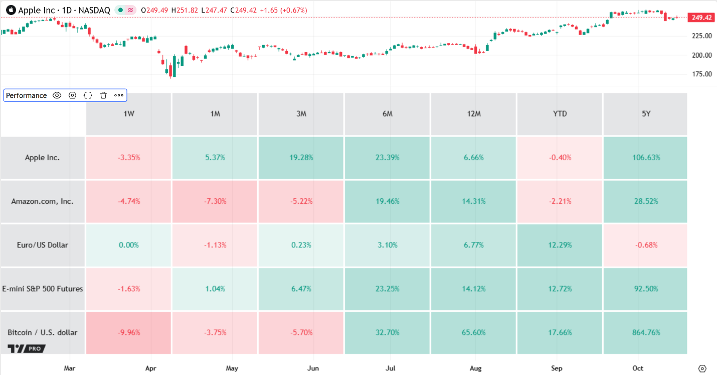 على سبيل المثال، إذا كان آخر سعر للرموز هو 215.00 وسعر إغلاق شريط الربط «1M» هو 193.00، فإن قيمة الأداء الناتجة هي 100* (215 - 193)/193 = 11.40%. تشير هذه القيمة إلى أن سعر الرمز ارتفع بأكثر من أحد عشر بالمائة خلال فترة الشهر الأخيرة.