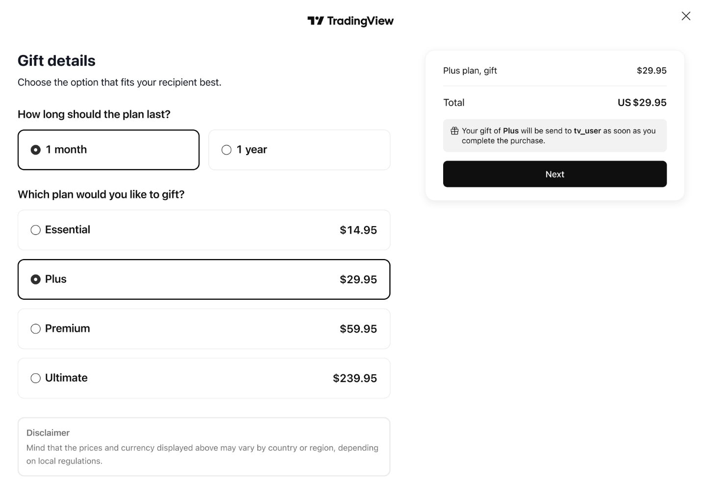 - حدد الاشتراك المطلوب وأكمل الدفع. لاحظ أنه يمكنك إهداء خطة شهرية أو سنوية.