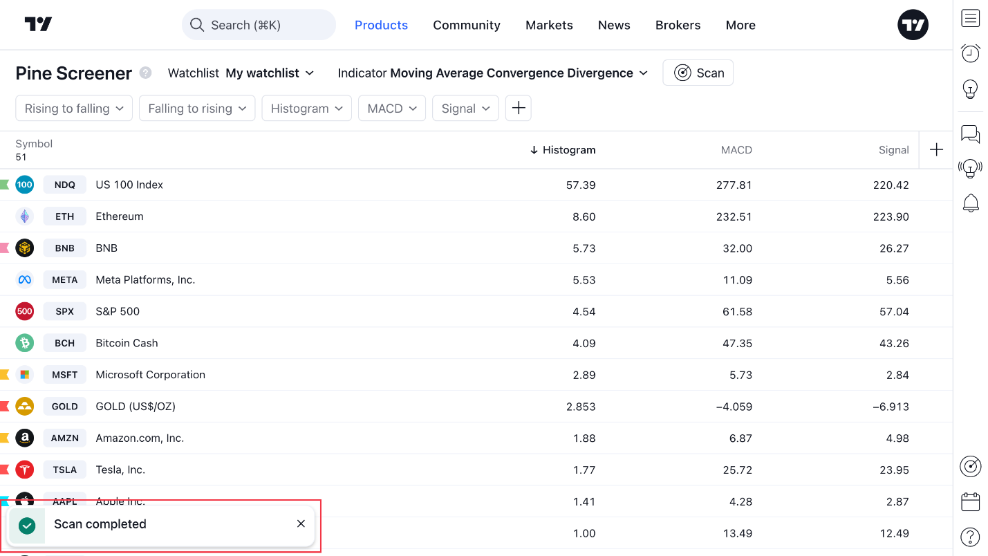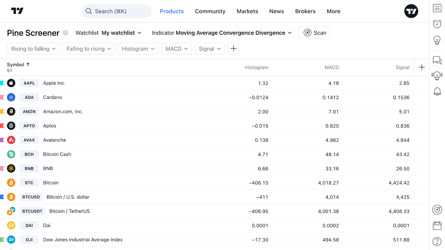 يمكنك العمل مع مجموعة كاملة من الرموز بغض النظر عن نوع الرمز. يمكن لـ Pine Screener مسح قائمة مراقبة كاملة تحتوي على الأسهم ورموز العملات الرقمية والسندات والأصول الأخرى.