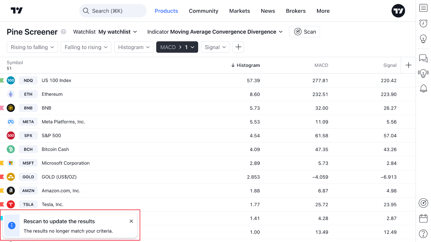 إذا كانت لديك مؤشراتك المخصصة التي تم إنشاؤها باستخدام Pine Script®، فيمكنك تضمينها في أداة الفحص ومعرفة كيف تبدو أصولك المفضلة من منظور وجهة نظر التداول الفريدة الخاصة بك.