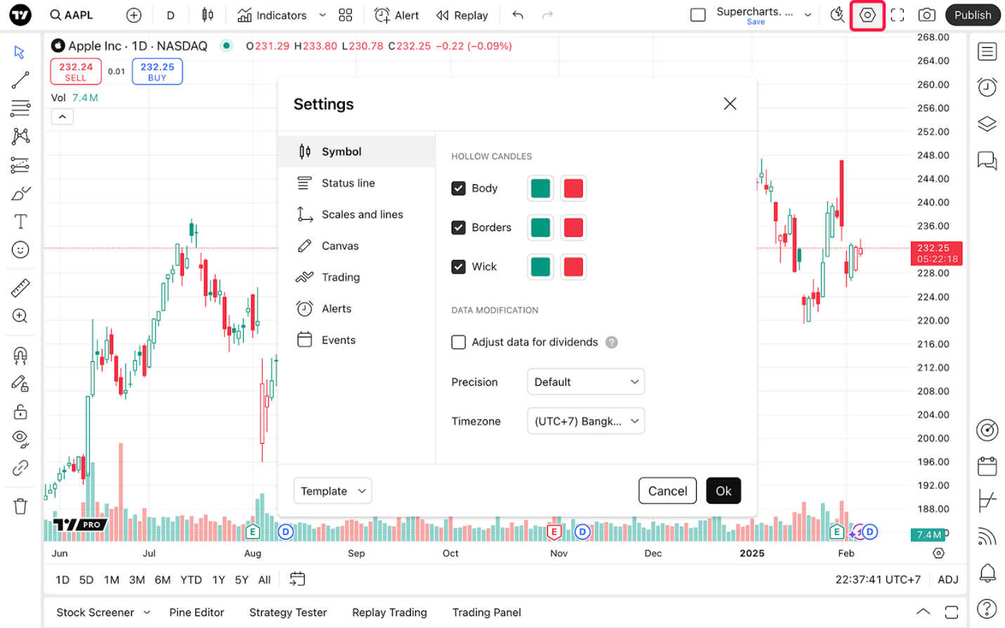 بمجرد دخولك إلى Supercharts، افتح قائمة نوع الرسم على عمود الأدوات العلوي، وحدد الشموع المجوفة.