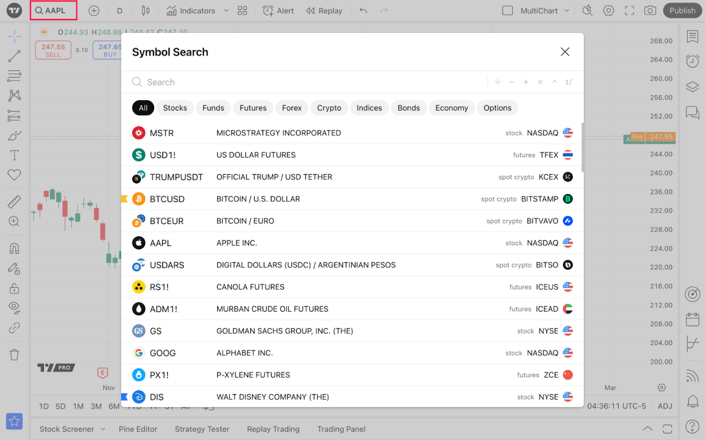- ابدأ بكتابة الرمز. على سبيل المثال، لفتح مخطط أسهم Apple، ما عليك سوى كتابة «AAPL»