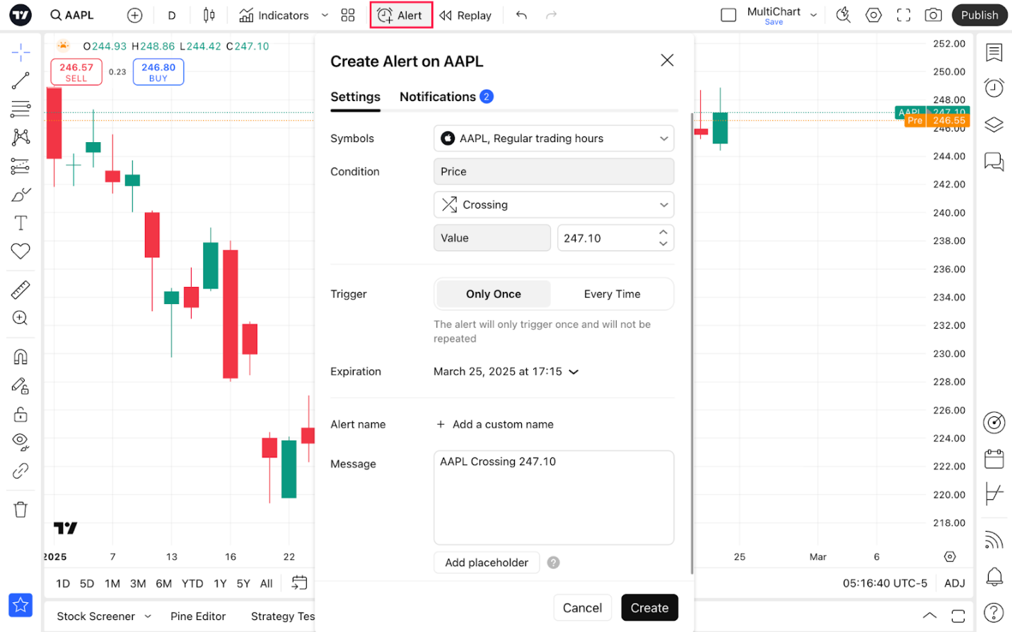 تتيح لك هذه الميزة إعداد التنبيهات وإدارة الإشعارات الخاصة بها. باستخدام هذه الأدوات الأساسية، ستتابع دائمًا الأسعار أو المؤشرات أو الاستراتيجيات أو الرسومات. يمكنك اختيار الشرط الذي سيؤدي إلى تشغيل التنبيه وتاريخ انتهاء صلاحيته وترك رسالة بجانبه وغير ذلك الكثير.