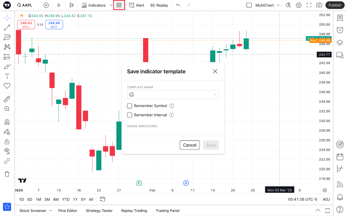 باستخدام قوالب المؤشرات، يمكنك حفظ المؤشرات التي اخترتها لاستخدامها لاحقًا. عند الحفظ، يمكنك أيضًا تذكر الرمز والفاصل الزمني حتى تتمكن من تحميلهما في نفس الوقت مع القالب. انقر فوق فتح القالب لرؤية نافذة قوالب المؤشرات وإدارة القوالب خاصتك.