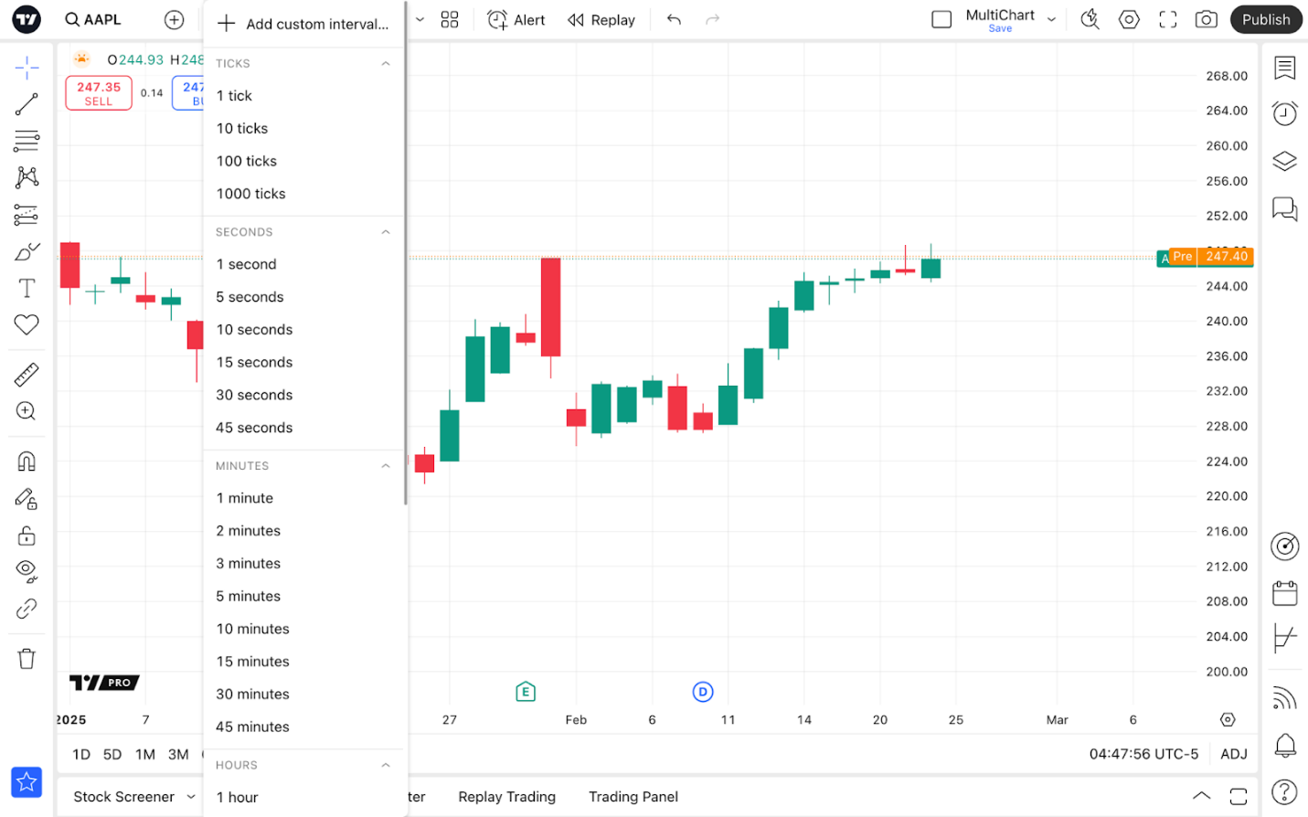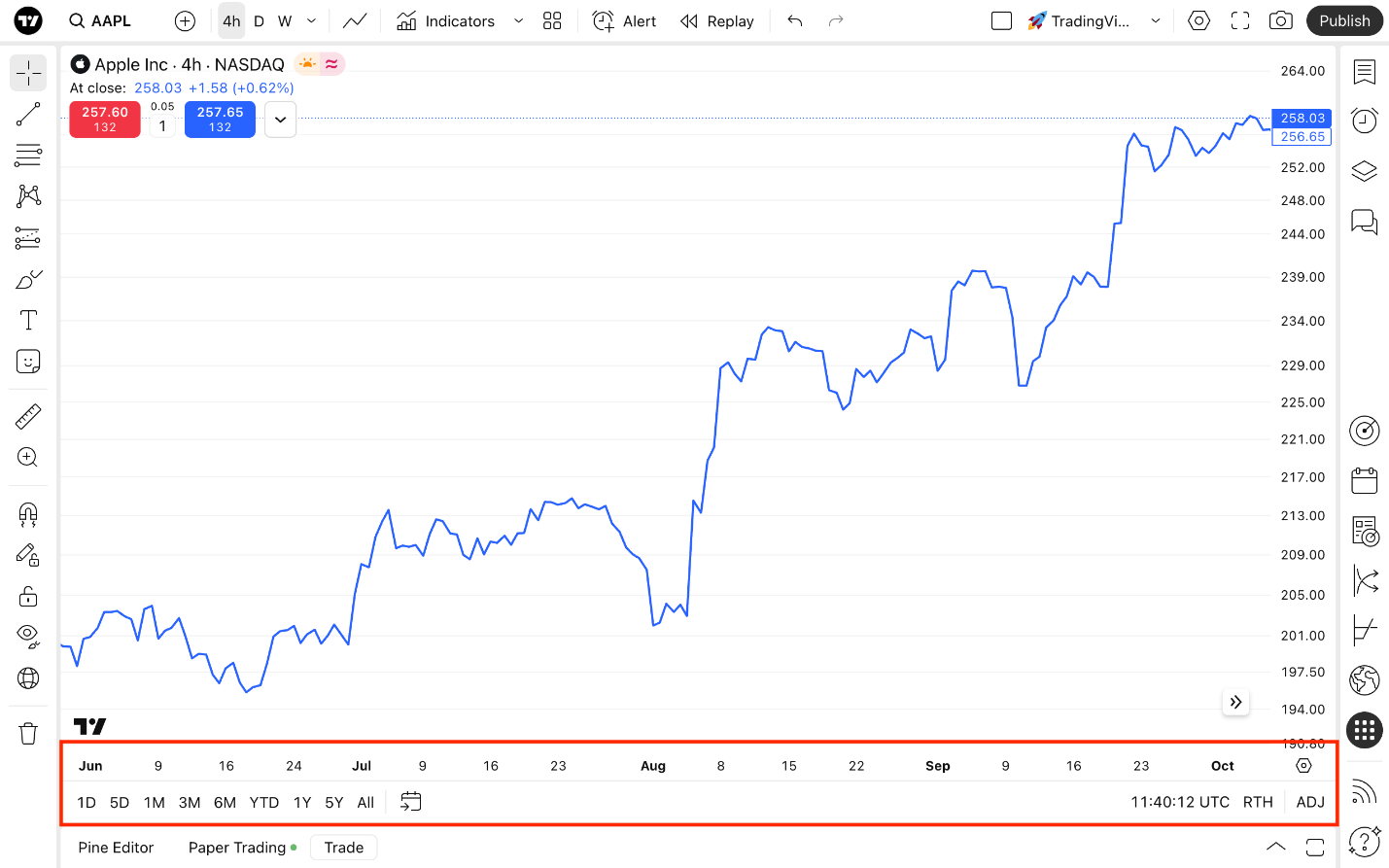 ضمن المقياس الزمني، يمكنك العثور على الفواصل الزمنية المحددة مسبقًا لتناسب شاشتك. اختيار 1D، على سبيل المثال، يضبط المخطط لعرض يوم تداول واحد باستخدام فترات دقيقة واحدة. يؤدي الضغط على «الكل» إلى عرض جميع البيانات التاريخية المتاحة باستخدام فترات شهرية. إذا لم يناسبك أي من الفواصل الزمنية، فيمكنك الانتقال إلى تاريخ محدد أو إنشاء نطاق مخصص في قائمة "الانتقال إلى".