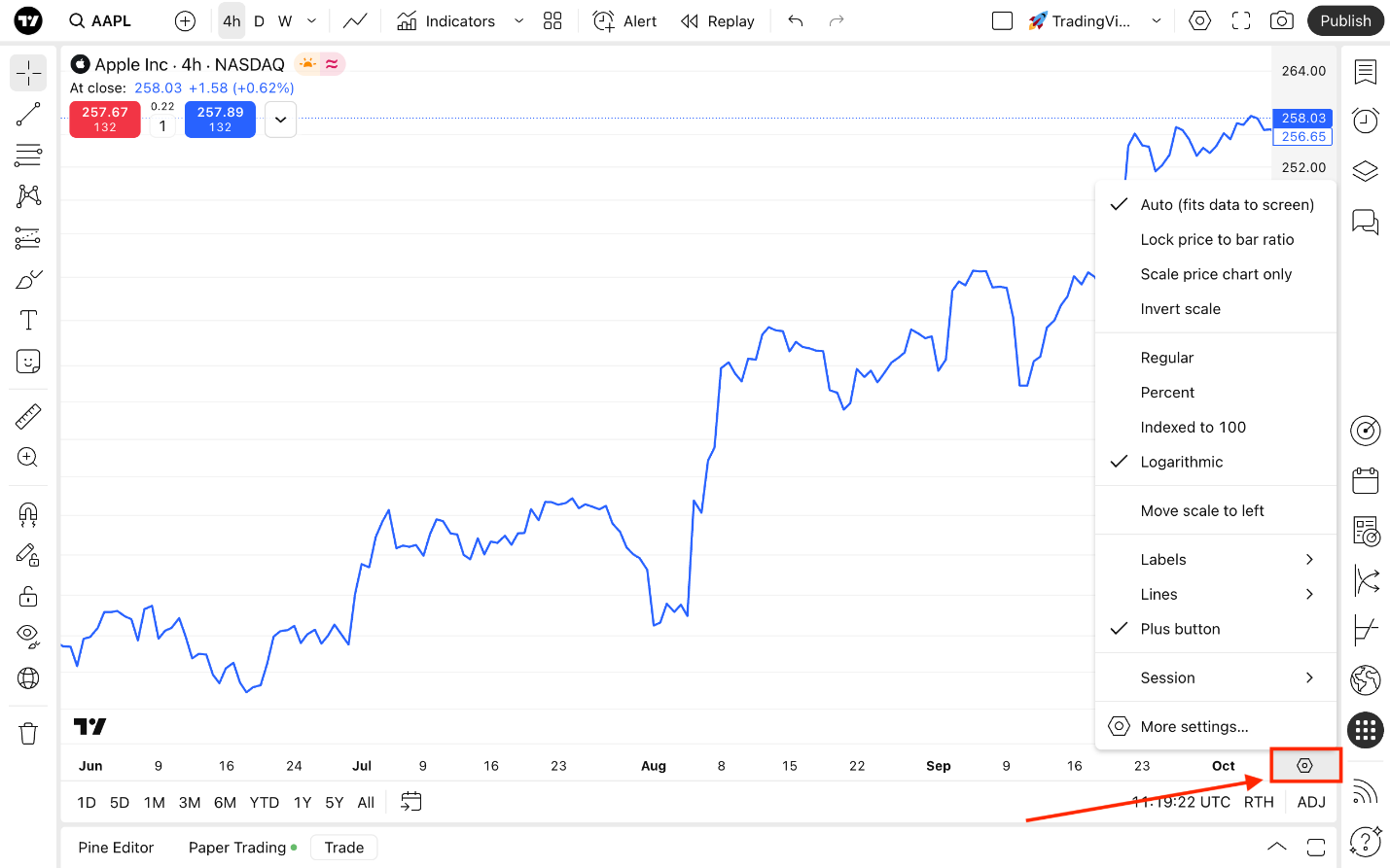 يمكنك تكوين الرسم كما تريد. لفتح قائمة الإعدادات، انقر فوق زر الإعدادات في الزاوية اليمنى العليا أو انقر نقرًا مزدوجًا على خط السعر/العمود/الشمعة.