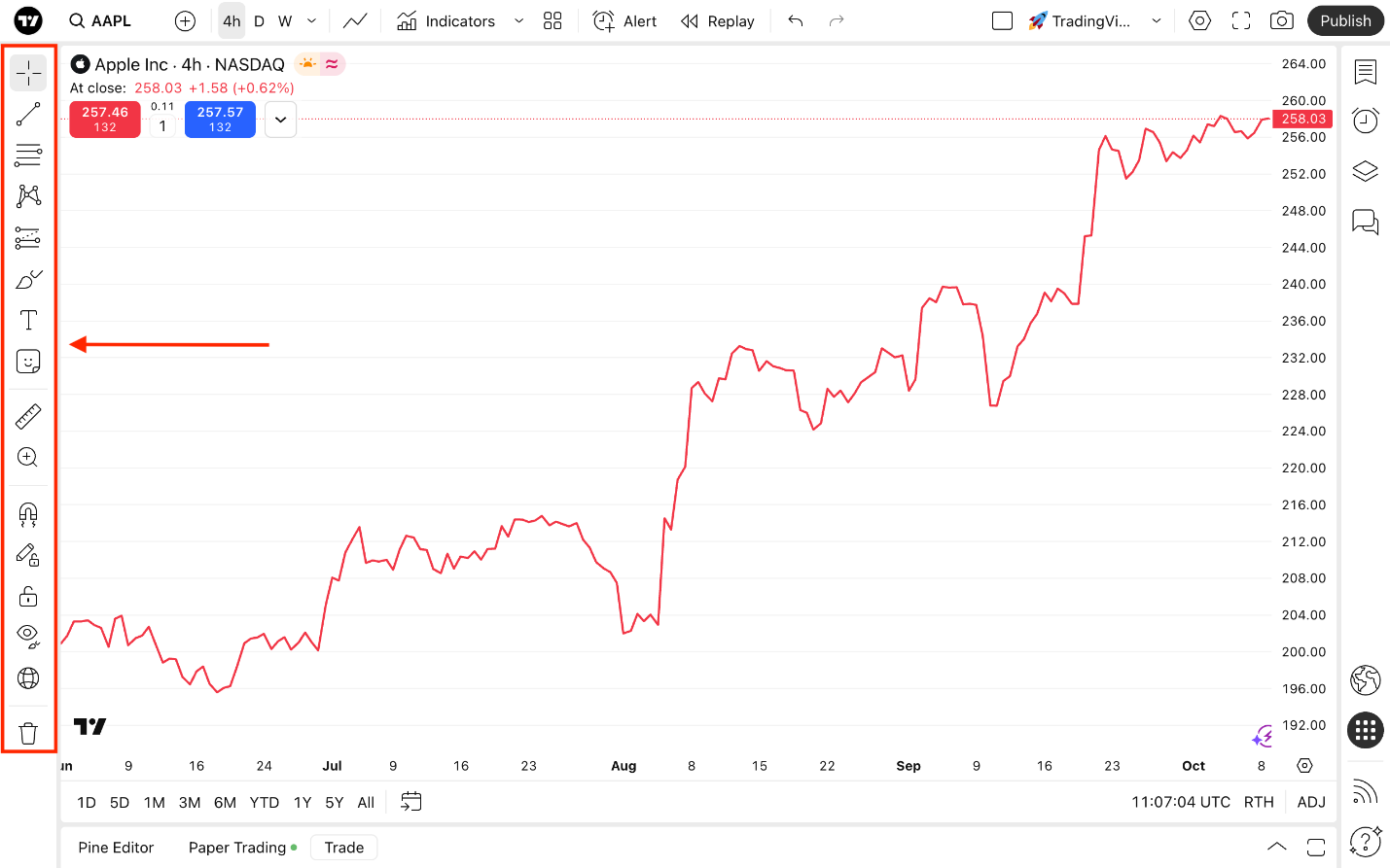 منه يمكنك الوصول إلى أدوات الرسم لتدوين الملاحظات وإضافة التعليقات وتحديد الاتجاهات والأنماط وإجراء القياسات والتنبؤات وحساب مستويات الأسعار.