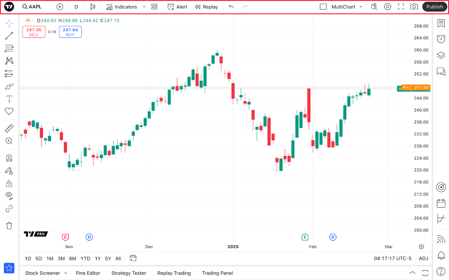 - لوحة التداول: قم بتوصيل الوسيط المفضل لديك للتداول مباشرة من الرسم البياني الخاص بك