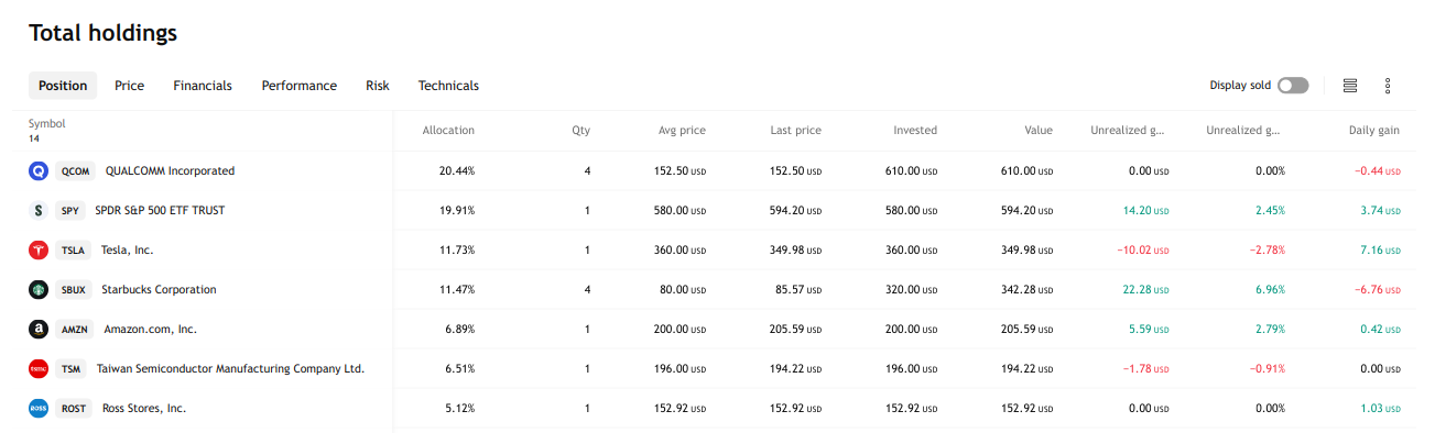 ملاحظة: الربح المحقق للمركز = الربح الإجمالي - الربح غير المحقق. المزيد في المقالة: ملخص المحفظة: الربح الإجمالي والمتحقق. - إجمالي الربح% - الربح نسبة إلى المستثمر