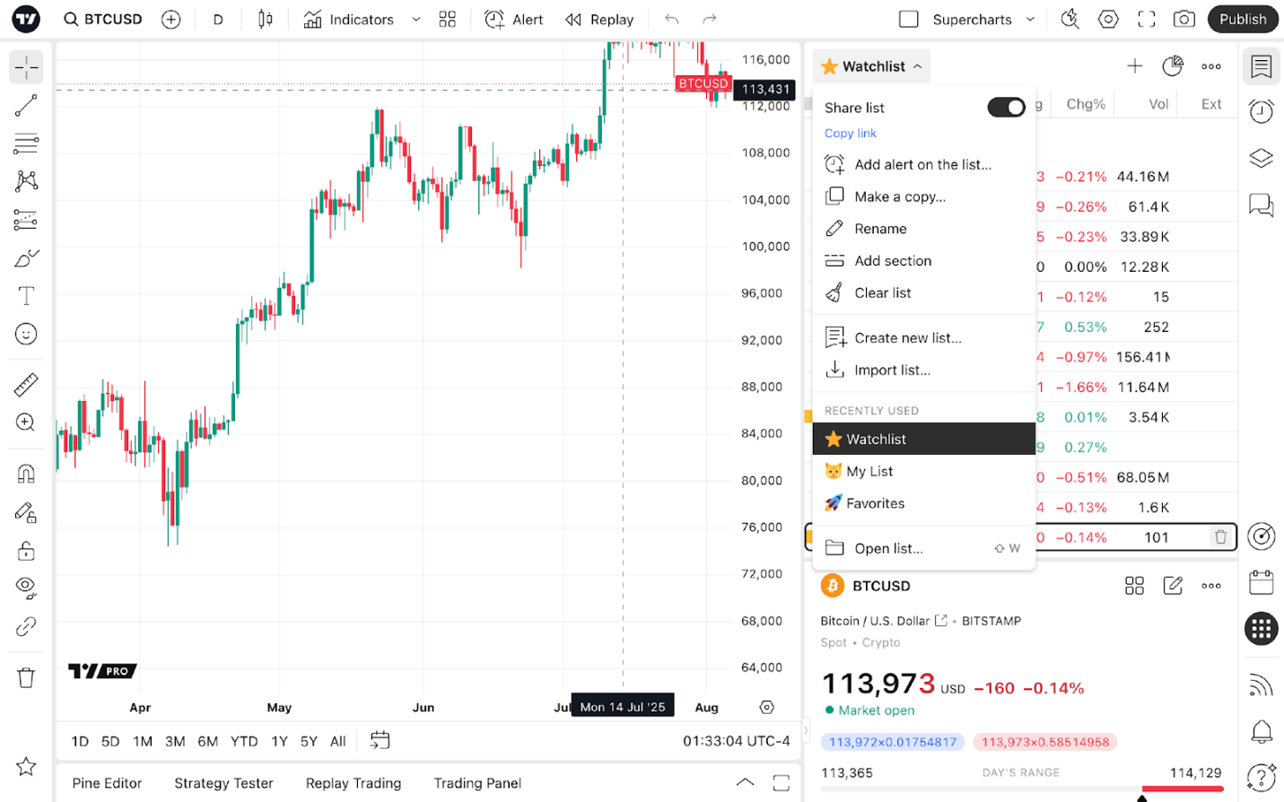 في ظل فوضى الأسواق العالمية، توفر القوائم الساخنة لـ TradingView الوضوح من خلال تسليط الضوء على ما يهم الآن. إنها تساعدك على التخلص من الضوضاء والتركيز على الفرص الحقيقية. عند نسخها، فإنها توفر الوظائف الكاملة لقوائم المراقبة الخاصة بنا، والتي يمكنك استخدامها لتخصيص القوائم بشكل أكبر وتكييفها وفقًا لاستراتيجيتك.