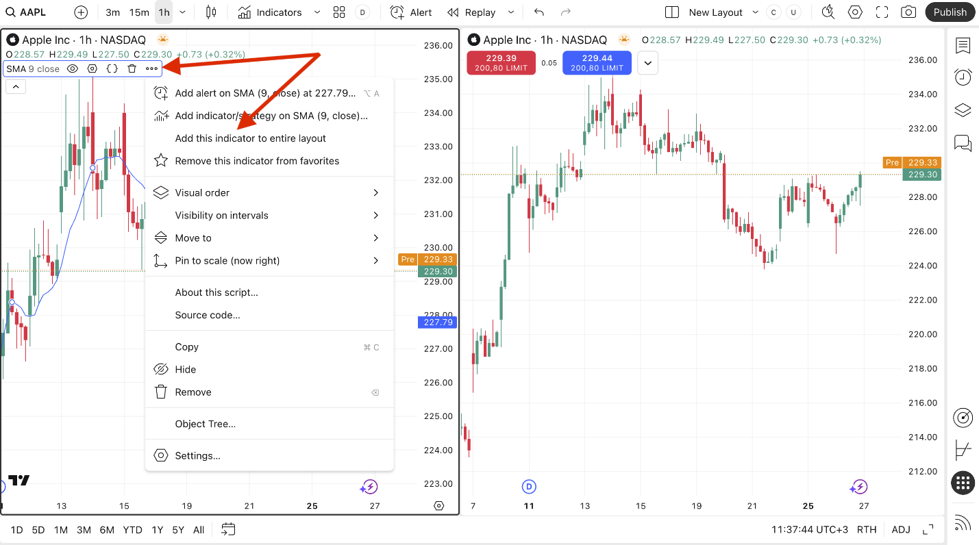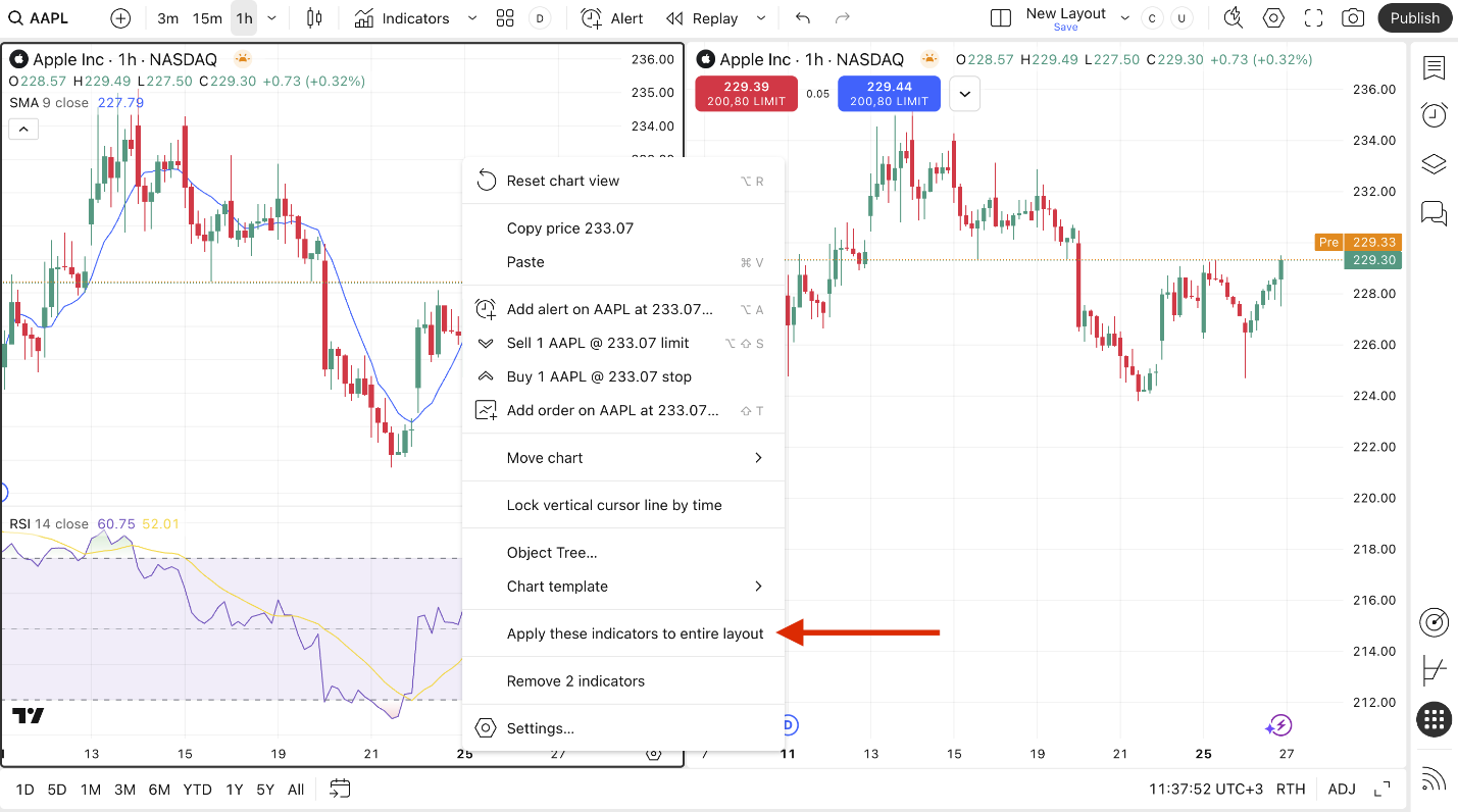 لإضافة عدة مؤشرات من مخطط واحد في تنسيق متعدد المخططات للجميع، يمكنك أيضًا النقر بزر الماوس الأيمن على المخطط وتحديد تطبيق هذه المؤشرات على التنسيق بأكمله.