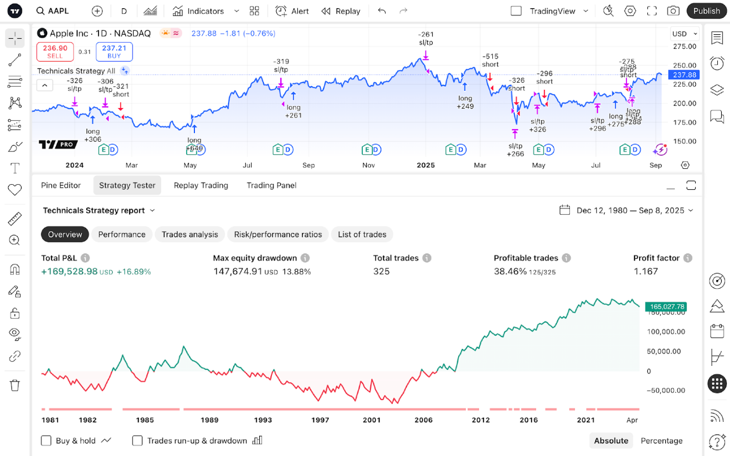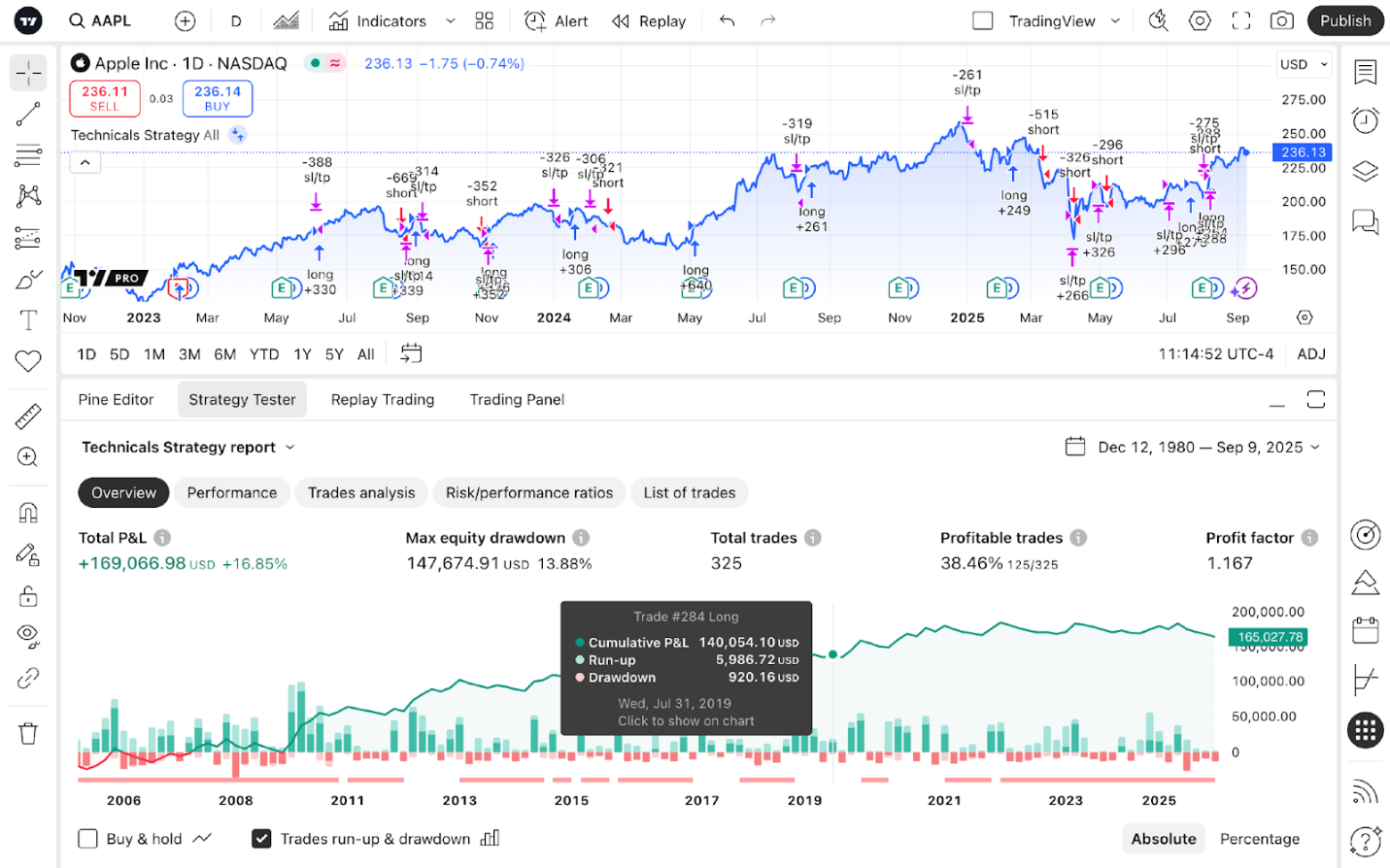 يتم فتح أداة اختبار الإستراتيجية تلقائيًا عند إضافة أي استراتيجية وتوضح كيفية أداء نظام التداول الخاص بك على البيانات التاريخية. يمكن تشغيل استراتيجية واحدة فقط على الرسم البياني في كل مرة.