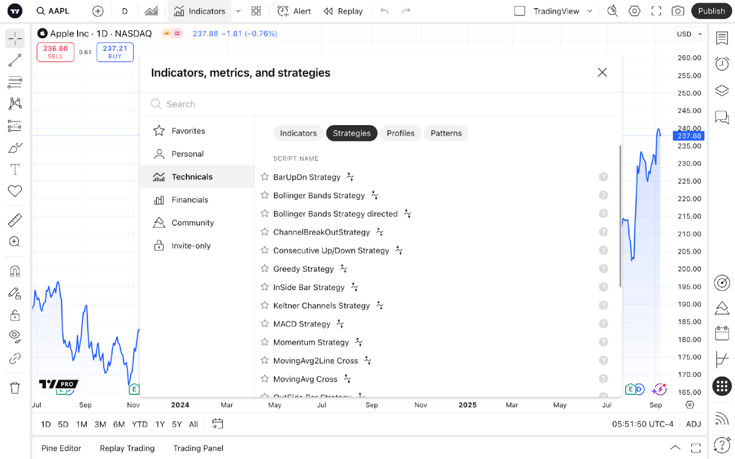 - استراتيجياتي: الاستراتيجيات الخاصة بك المكتوبة بلغة Pine Script، أو تلك التي قمت بحفظها في المفضلة.