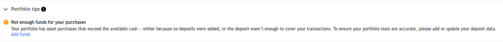 عندما يكتشف النظام عدم وجود أموال كافية في وقت شراء الأصول، سترى إشعارًا يطالبك بإضافة معاملة نقدية.