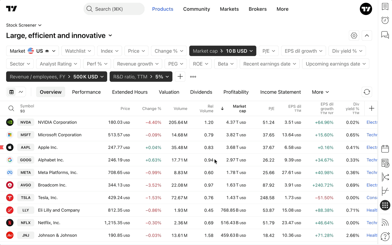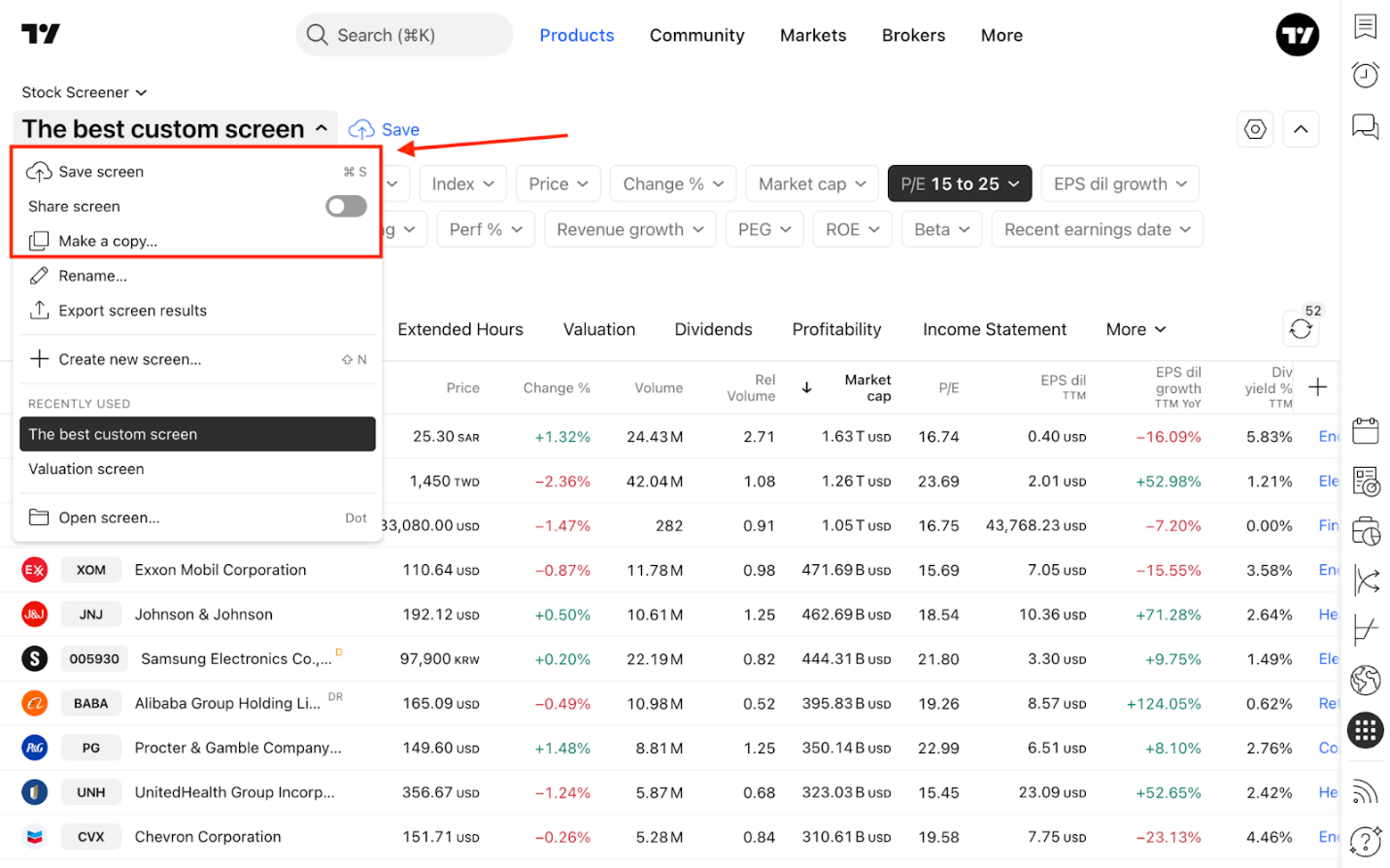 باستخدام منصات الفلترة TradingView، يمكنك مشاركة إعداد منصات الفلترة الكامل الخاص بك، بما في ذلك الفلاتر والفرز والأعمدة وقوائم المراقبة. يمكن لأصدقائك والمتداولين الآخرين عرض التكوينات المخصصة الخاصة بك وعمل نسخ وتطبيقها على أبحاثهم الخاصة.
