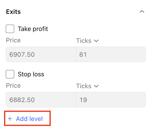 بمجرد التهيئة، يمكن حفظ مستويات الخروج بترتيب مسبق جنبًا إلى جنب مع معايير الطلب الأخرى. سيتيح لك ذلك إنشاء أوامر بسرعة بمستويات خروج متعددة.