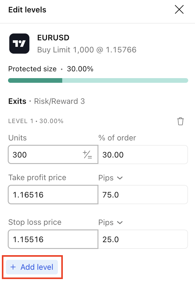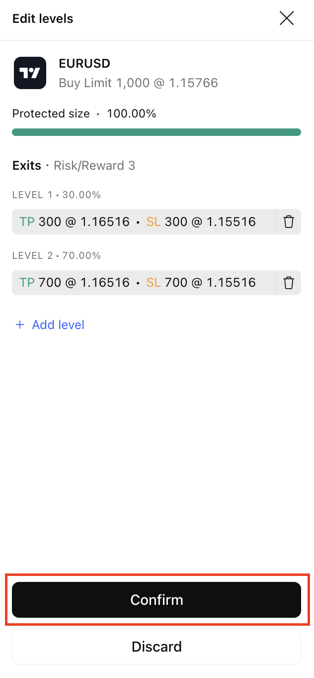تتيح هذه الميزة للمتداولين إضافة مستويات متعددة لجني الأرباح (TP) ووقف الخسارة (SL) إلى أمر أو مركز. يتم استخدام هذا لتخصيص استراتيجيات إدارة المراكز والخروج تلقائيًا من المراكز في أجزاء بمستويات أسعار محددة مسبقًا.
